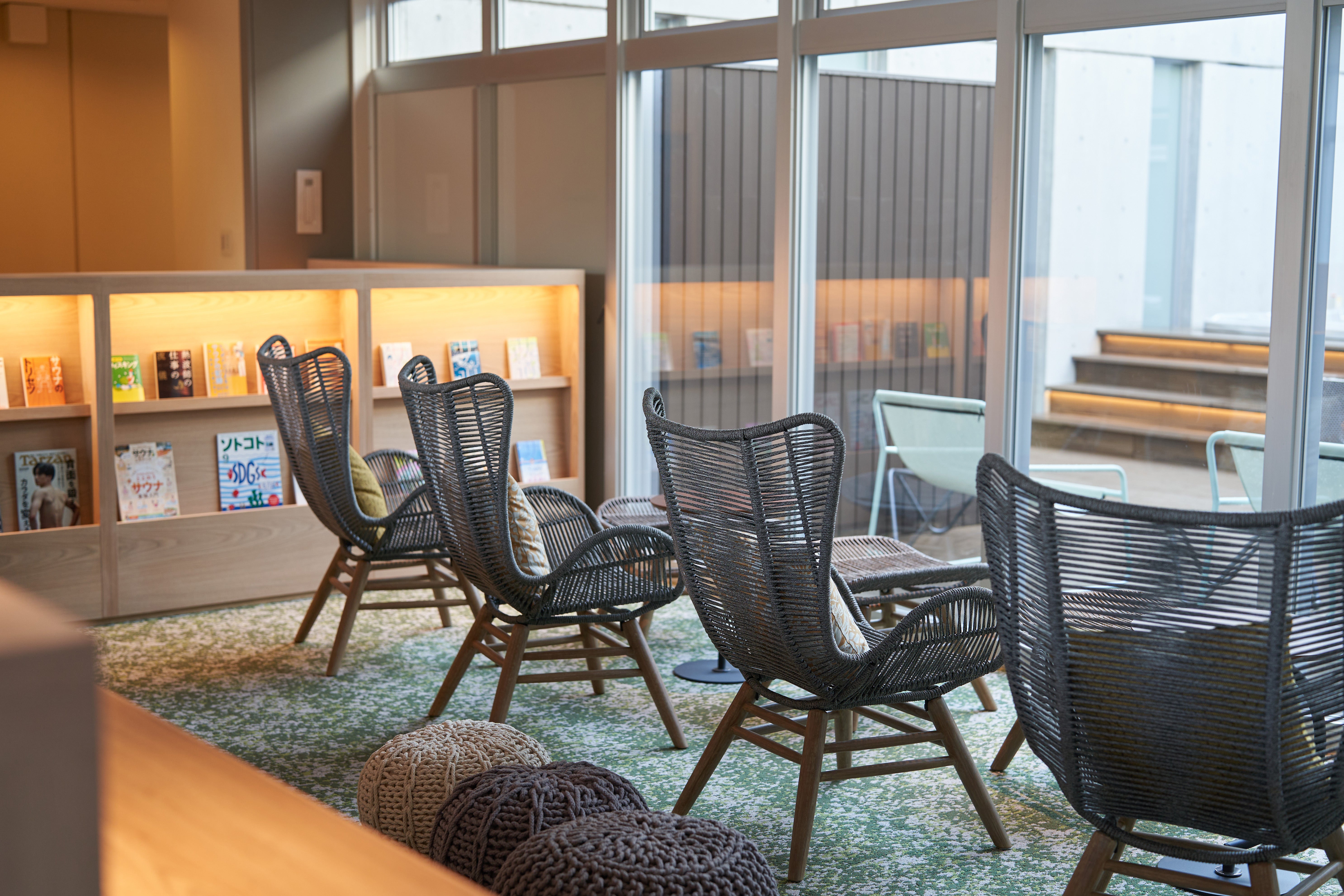 屋内のラウンジエリアでは、ゆったりと内気浴やフリードリンク、書籍などをお楽しみいただけます。