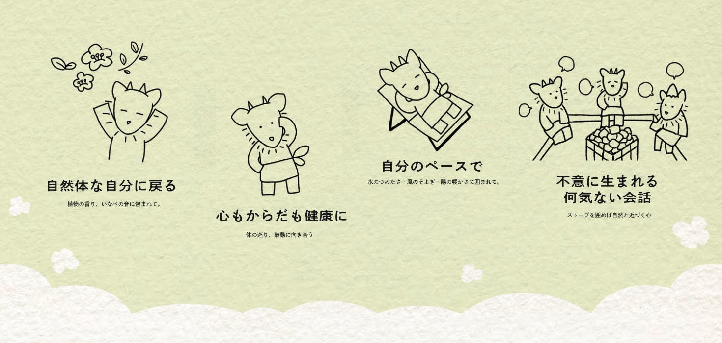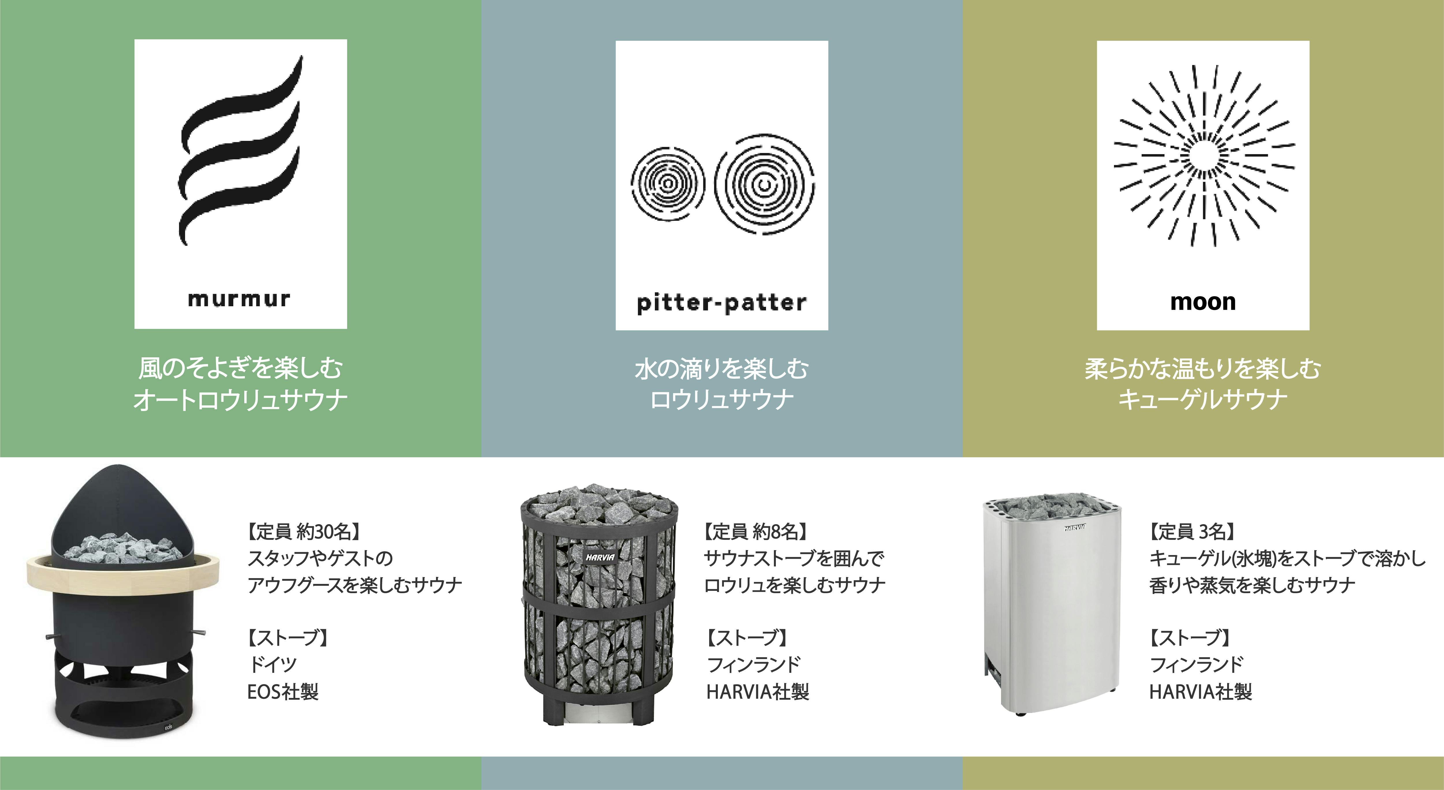 3種のサウナは、それぞれオノマトペから着想を得たネーミングにしています。