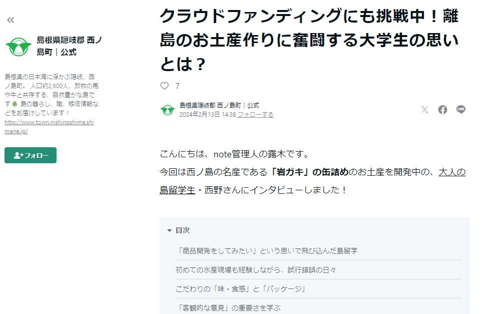 こんばんは。このプロジェクト実行者の西野春華です。西ノ島町の公式noteにお土産品開発への思いを綴った私のインタビュー記事が上がりました!是非ご覧ください!!noteの記事はこちら↓クラウドファンディングにも挑戦中!離島のお土産作りに奮闘する大学生の思いとは?(クラファンの本文記事と若干内容が被る部分がございます。)また以前に岩ガキ養殖のパイオニアである中上光さんにインタビューさせて頂いた記事もございますので興味がある方は是非ご覧ください。離島でお土産開発を目指す大学生が、岩ガキ養殖のパイオニアへインタビュー!引き続き応援よろしくお願いします。