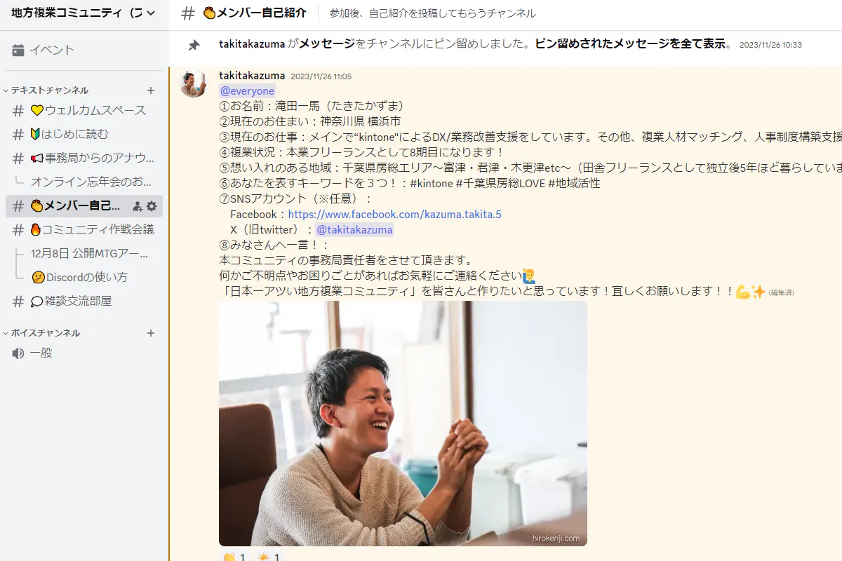 現在、有志による試験的にDiscordコミュニティが運営されていて、メンバーの自己紹介や、コミュニティ作戦会議、また雑談交流チャットなどで活発な交流が行われています!直近ではコミュニティの運用に関する公開ZOOM会議が行われたり、オンライン忘年会の企画が立ち上がったりしています。2024年1月には「メンバー1人の夢や目標に対して、みんなでアイデアを出し合うイベント」も立ち上がるようで、すでに学び合い・助け合いの暖かい空気が出来上がっています。