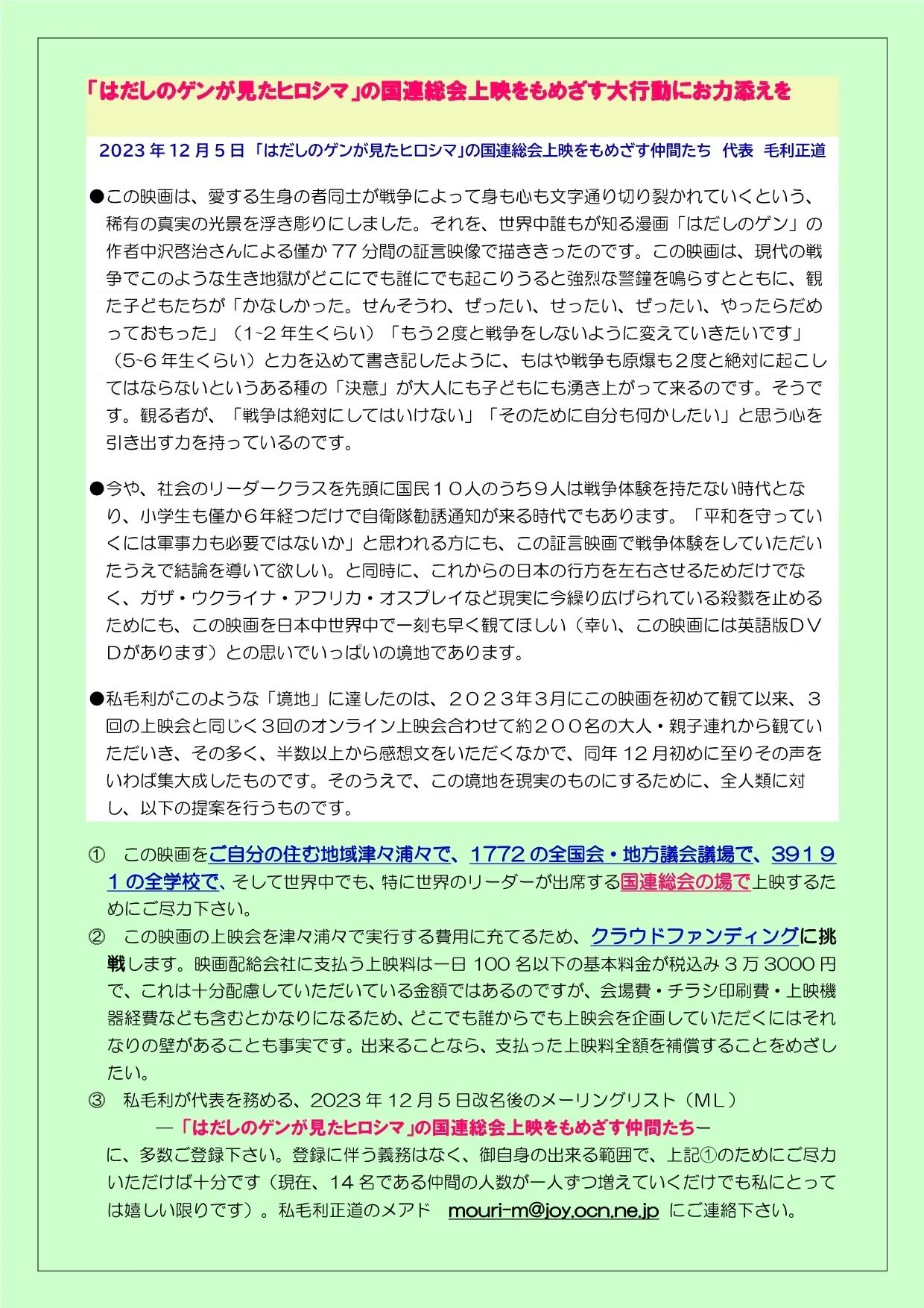 この「はだしのゲンが見たヒロシマ」の国連総会上映をもめざす仲間たちは、2023年8月に実行者の呼びかけに応えて結集した15名によって結成されたものです。実行者は、2023年5月以来、現在までに、実行者が代表である「すわこ文化村」の主催で3回、「仲間たち」の主催でオンライン上映3回、この映画の上映会を開催していますが、この6回の上映会とも、この映画製作配給会社である(株)トモ・コーポレーションとの契約により実施して来ており、特にオンライン上映会は同社と実行者との唯一の特約により実施できているものです。自ら主催する上映会や全国で新たな主催希望者が開催する上映会が容易に開催できるためには、財政面での心配が少なくて済むことが肝要ですので、主催者が配給会社に支払う上映料(一日100名以下の基本上映料33,000円)を当会が負担できることをめざし、本クラファンに応募することにしたものです。