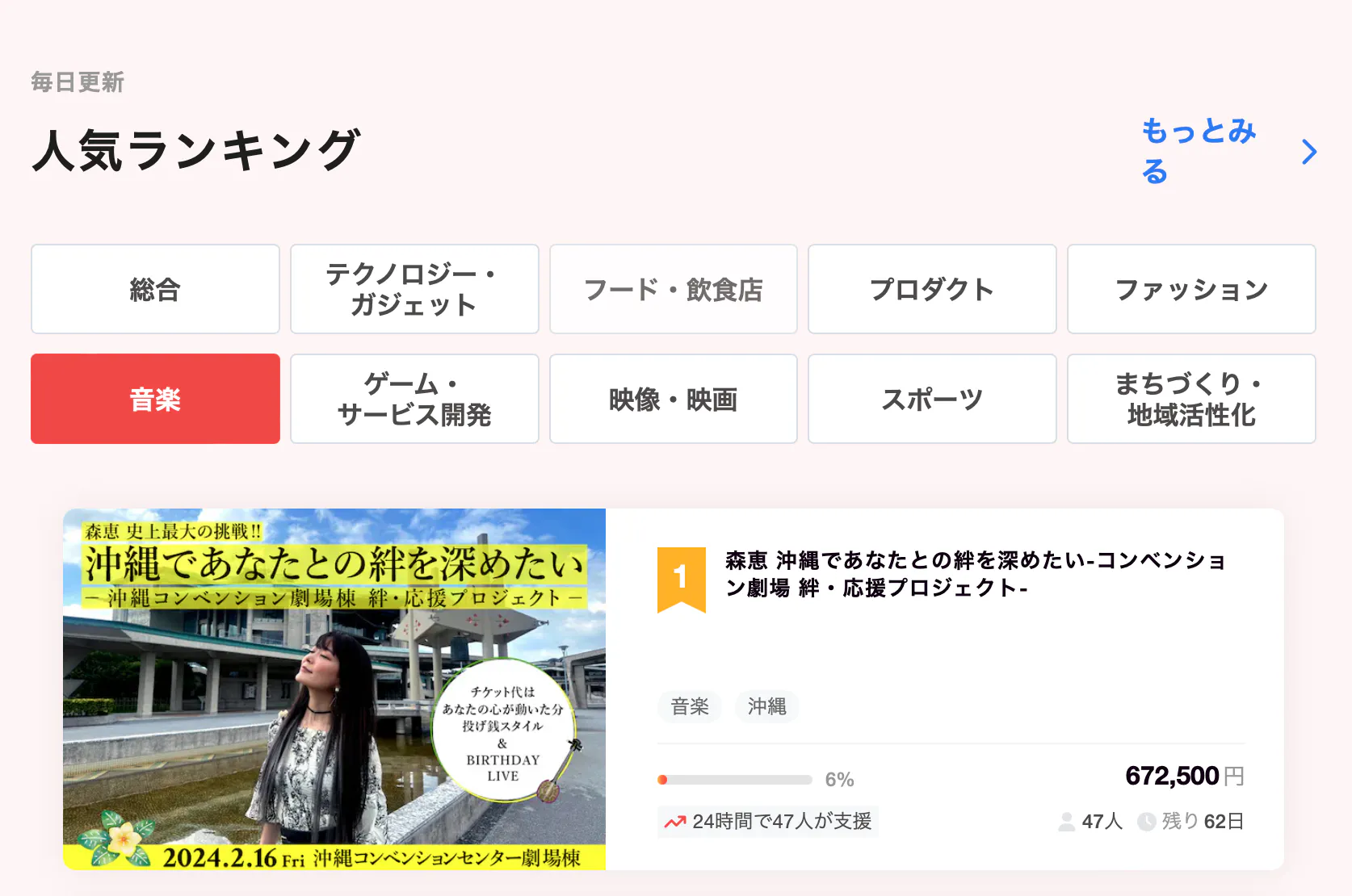 そんな 森恵の今回のプロジェクトは、今回も日本国内で最も有名な一つである CAMPFIREさんのプラットホームを使わせていただいてるのですが、その中で デイリーレポートというランキングがありまして、CAMPFIREで現在実施してる 数ある多数のクラウドファンディングのプロジェクトの中で、森恵のクラウドファンディングのプロジェクトが音楽部門で 第1位にランクインしました!!!!