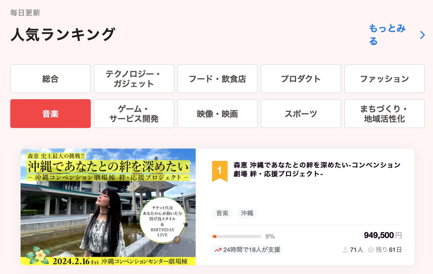 CAMPFIREのデイリーレポート(=閲覧数が多いランキング)の音楽部門で 森恵の今回のプロジェクトが2日連続1位となりました!