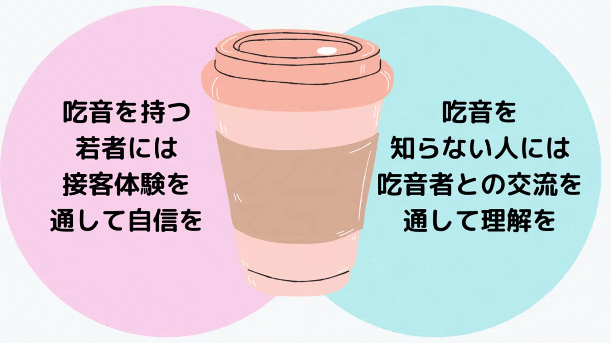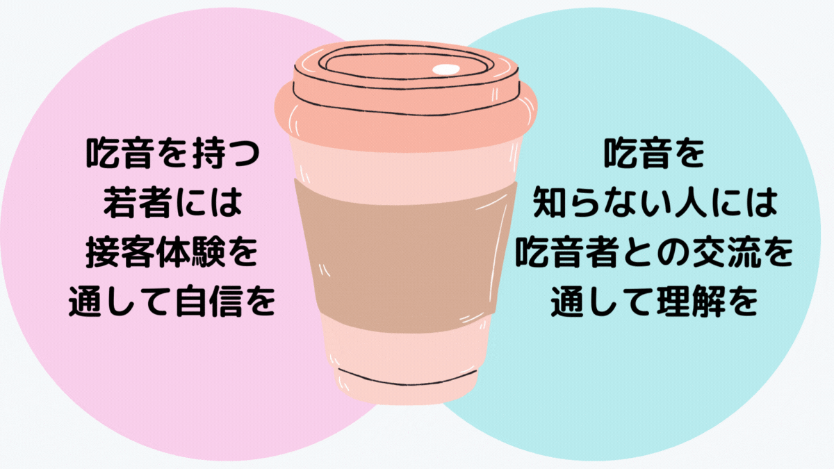 吃音を抱えながらも接客業に挑戦したいと願う若者たちに夢を叶えてもらうために、また吃音のある若者たちと交流することで、今まで吃音が身近ではなかった方々にも理解を広げることができます。