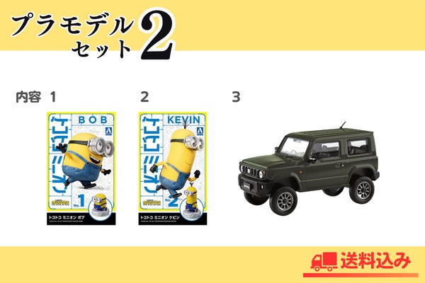プラモデルセット1のミニオンボブとミニオンケビンに加えて、 ザ・スナップキット No.8-SP1 スズキ ジムニー カスタムホイール(ジャングルグリーン)がついたセットです。
