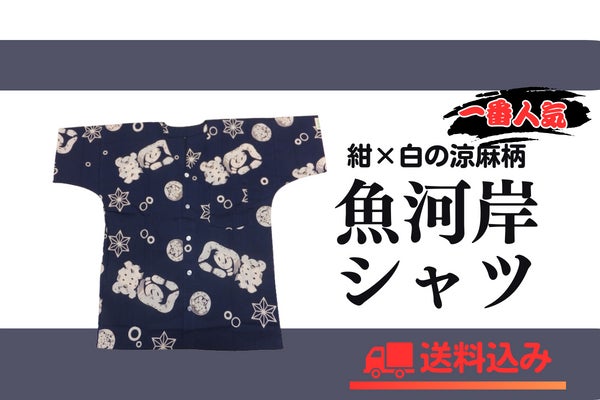 魚河岸シャツは、静岡県焼津市で昔から着られている、手ぬぐい生地の襟なしシャツで、デザインに魚がしロゴ・マークが染められているのが特徴です。