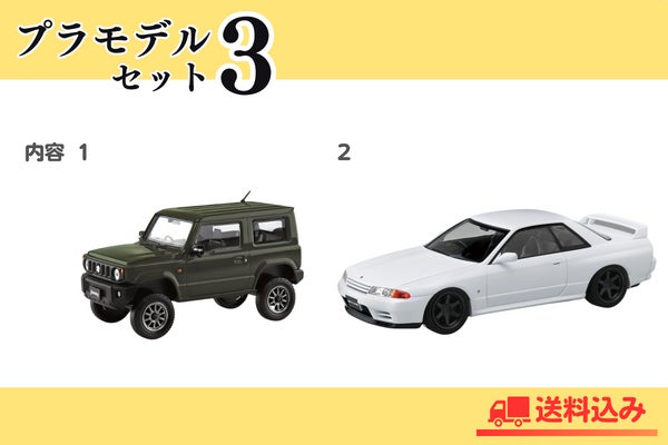 プラモデルセット3にあるジムニーに加えて、ニッサン R32スカイラインGT-R カスタムホイール(クリスタルホワイト)がセットになっています。