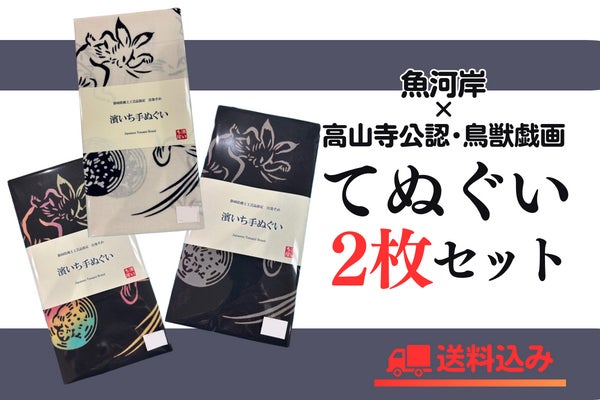 京都・高山寺公認 「鳥獣戯画×魚河岸てぬぐい」キナリ色1枚と、まだ通販サイト未掲載の新色(2色から1色お選びいただきます)1枚の2枚セットです。
