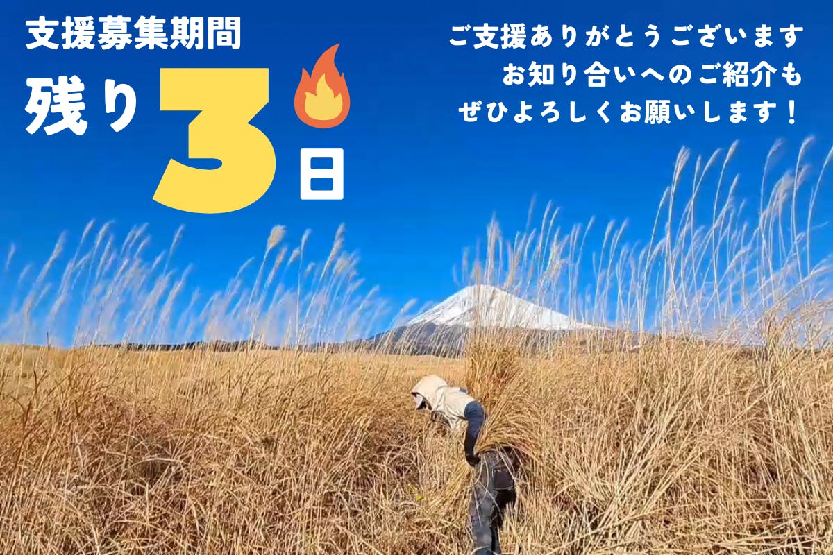 2024/03/25 12:00こんにちは!プロジェクトオーナーの富士勇和産業・長田です。3月22日(金)に本プロジェクトの募集期間が終了いたしました。クラウドファンディングという手段は私たちにとって初めての挑戦でしたが、420,000円という大きなご支援が集まりました!御殿場市内はもちろん、静岡県ではない都道府県から、そして同業者の方、様々な方から応援の気持ちをいただき、大変うれしく思っております。このプロジェクトを通して御殿場の茅や私たちの仕事に関心を持ってくださった方には感謝の気持ちとして必ずリターンをお返ししたいという想いで、本プロジェクトは「All-in」形式でスタートしております。集まった支援金は皆様にリターンとして茅に触れていただく機会をご提供することと、私たちが今後茅文化を知っていただくための新しい活動費に活用させていただきます。リターンにつきましては、ご支援内容により発送時期をそれぞれ設定させていただいております。準備ができましたら早めにお届けする場合もございますので、順次ご連絡させていただきます。まもなく春になりますが、私たちは白川をはじめ、東北から中国地方まで各地の茅葺きへ御殿場の茅を出荷していて、夏頃までこの出荷が続きます。今後もさまざまな場所で茅文化を広めていけるよう活動してまいりますので、引き続き見守っていただけますと幸いです。ご支援いただきありがとうございました! もっと見る