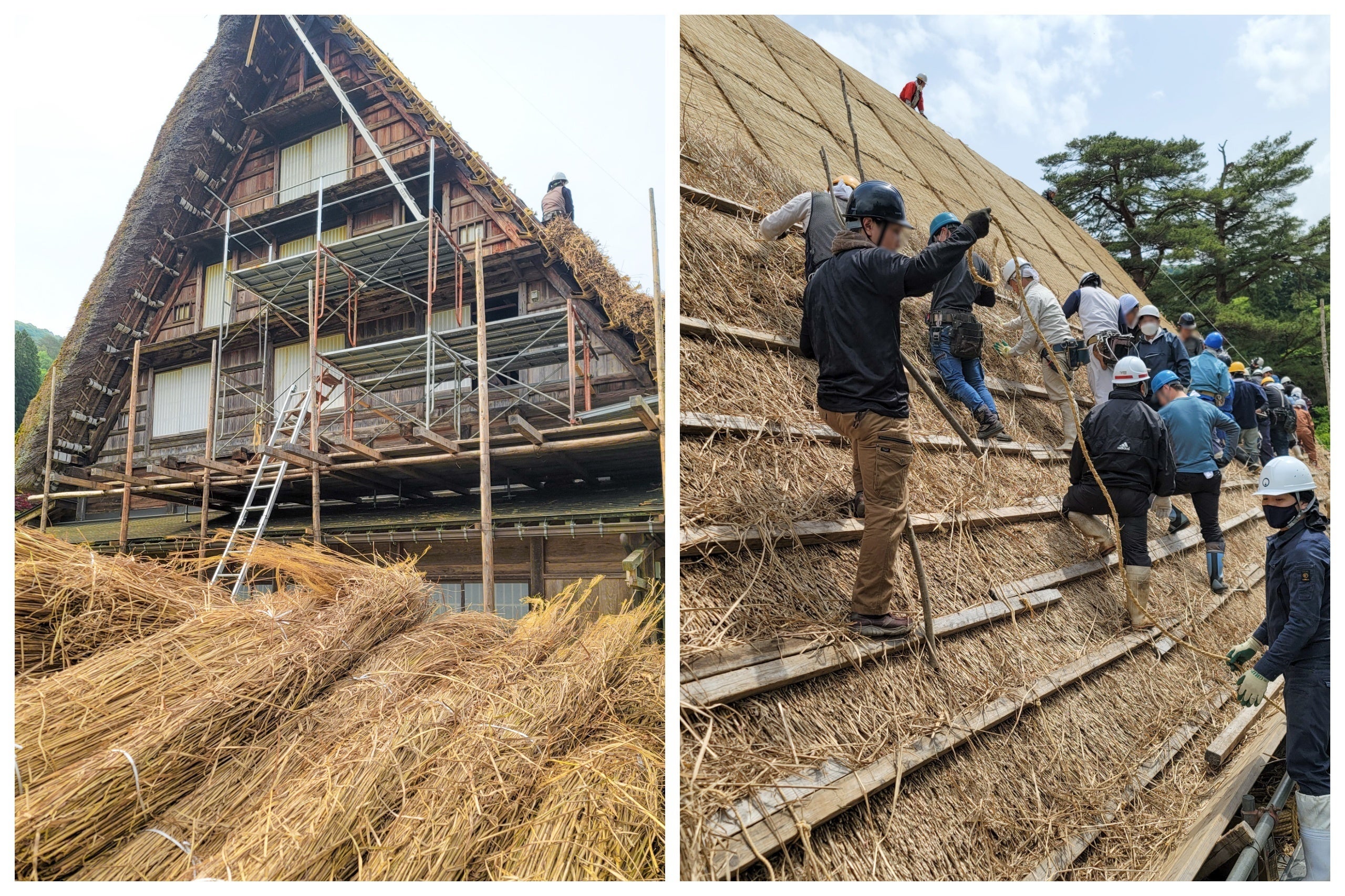 白川郷の合掌造り 茅葺屋根の葺き替え作業