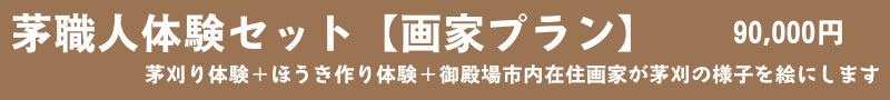 通常許可された事業者しか入ることができない御殿場市内の富士山麓の茅場で、特別に茅刈りができる体験です。茅刈りの様子を撮影し、画家※が絵画にしてプレゼントいたします。茅でほうきを作るワークショップもお楽しみいただけます。※本間勇(ほんまいさむ)