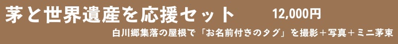 毎年行われる白川郷集落での茅葺き作業をご支援いただくセットです。ご支援のお礼に、白川郷での茅葺の際に屋根に支援者様のお名前入りのタグをのせた状態で撮影します。屋根に使うためにひとまとめにした茅=「茅束」のミニチュアサイズを、白川郷に使った茅と同じ茅で製作します。「ミニ茅束」に撮影に使ったお名前タグをつけて、写真と一緒にお届けします。