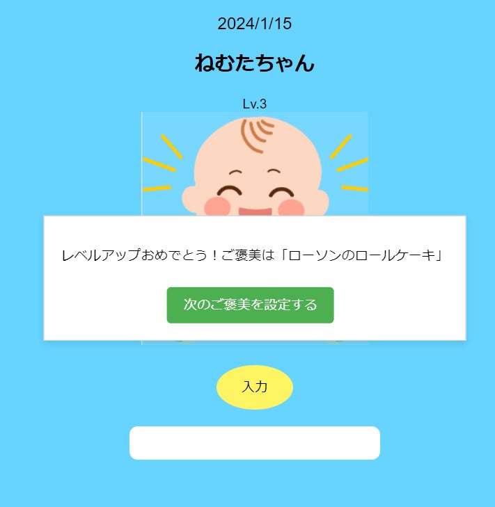 現在、レベルアップした際に次のごほうびが設定できる機能を開発中です。