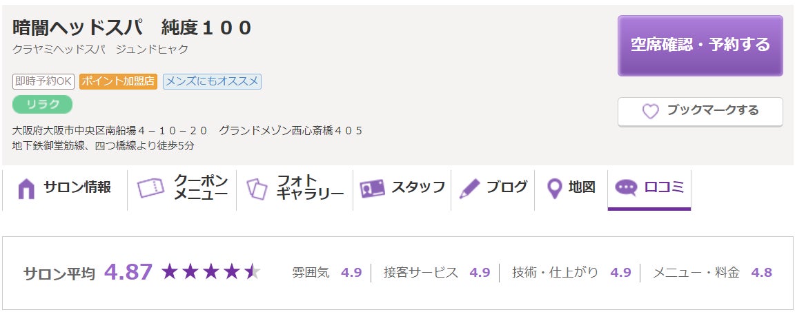 ※実際の現在のHOTPEPPER Beutyの暗闇ヘッドスパ 純度100にいただいている口コミ・評価の画像です