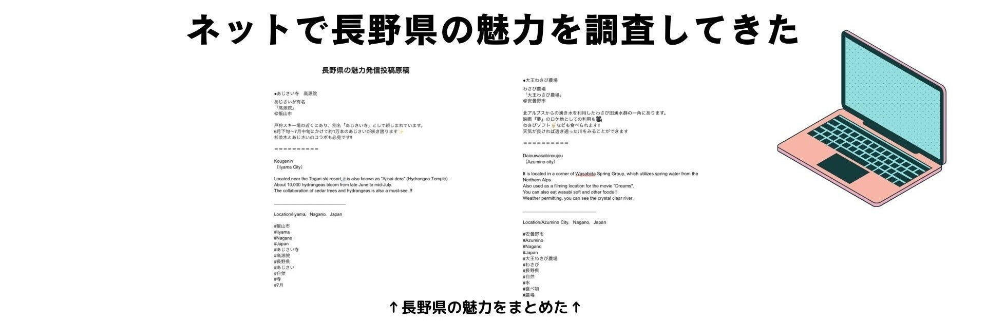 長野日大高校探究創造学科に入学した僕は、自分の好きな「長野県」の魅力をもっと多くの人に知ってもらいたいと思い活動を始めました。実際に行った活動は、長野県の魅力をインターネットで調査しました。様々な旅行会社のサイトや長野県のサイトを見ました。そして、調べた観光スポットへ行ったりもしました。