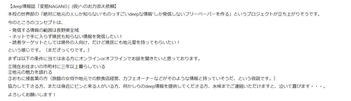私は自分の好きな「長野県」を広める活動をしています。その活動の1つとして、「長野県のdeepな情報が載っているフリーペーパー」を作っています。