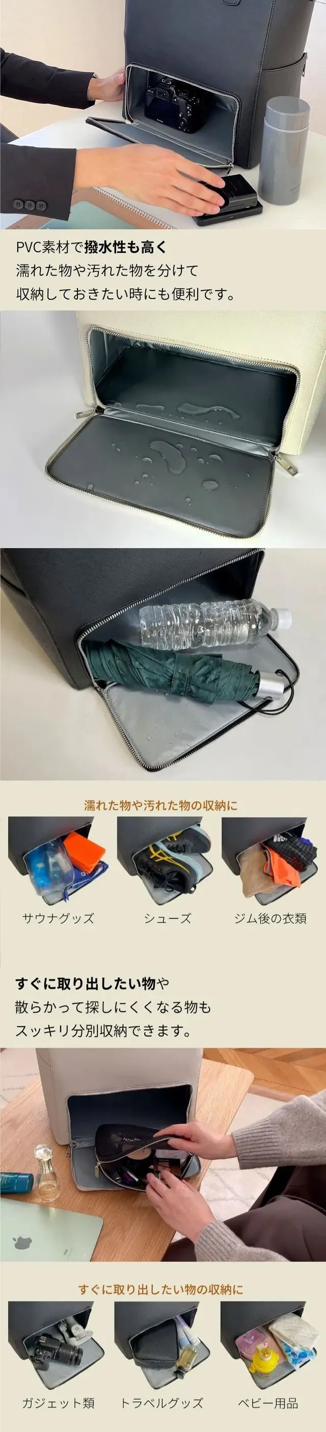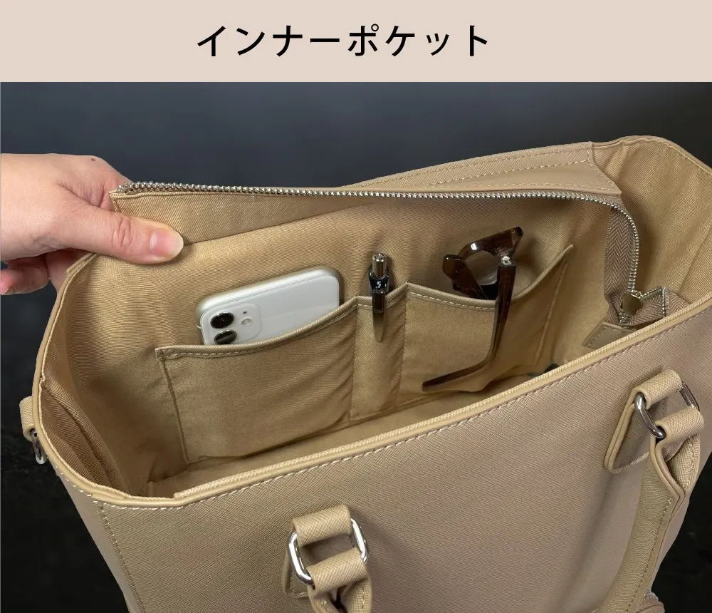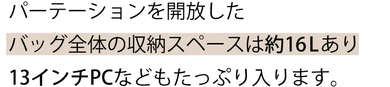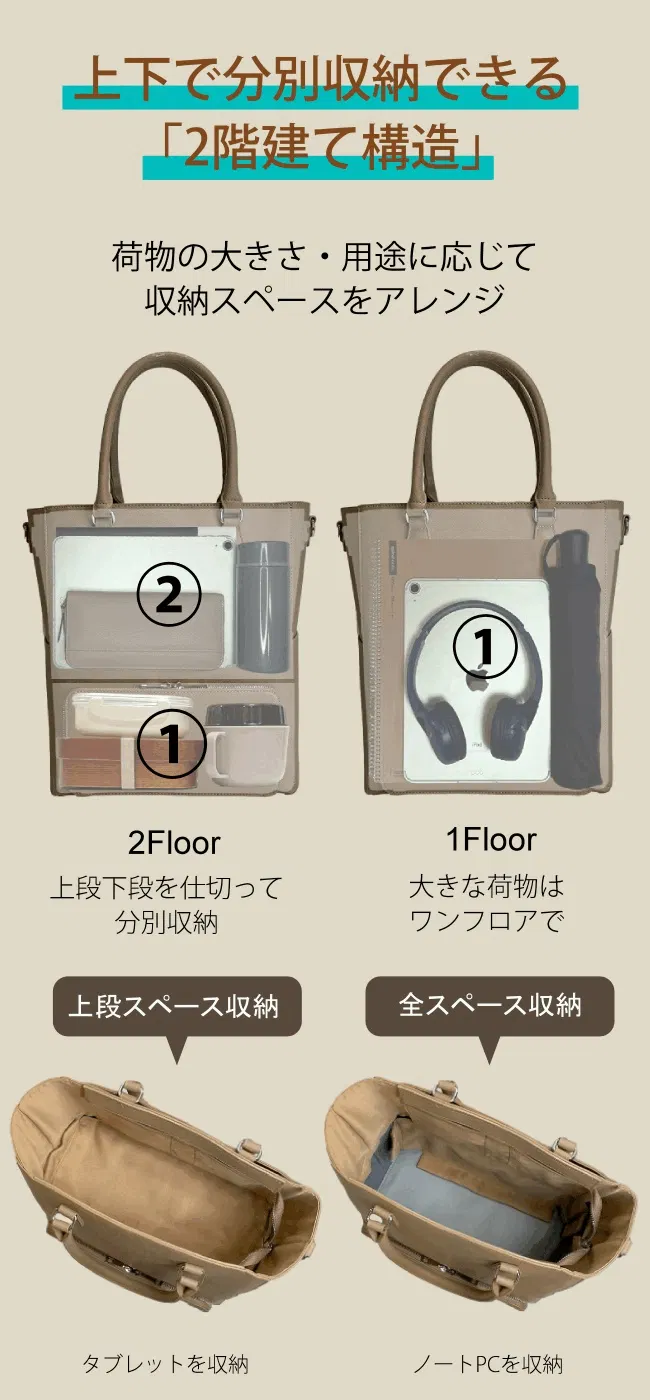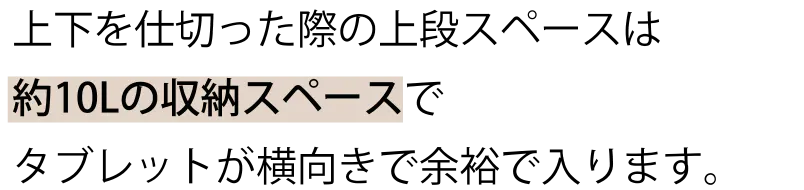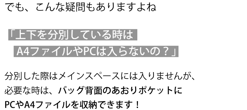 ※バッグの構造上、上下分別して使用する際は、重たいものは、出来る限り下段スペースやあおりポケットをご活用ください