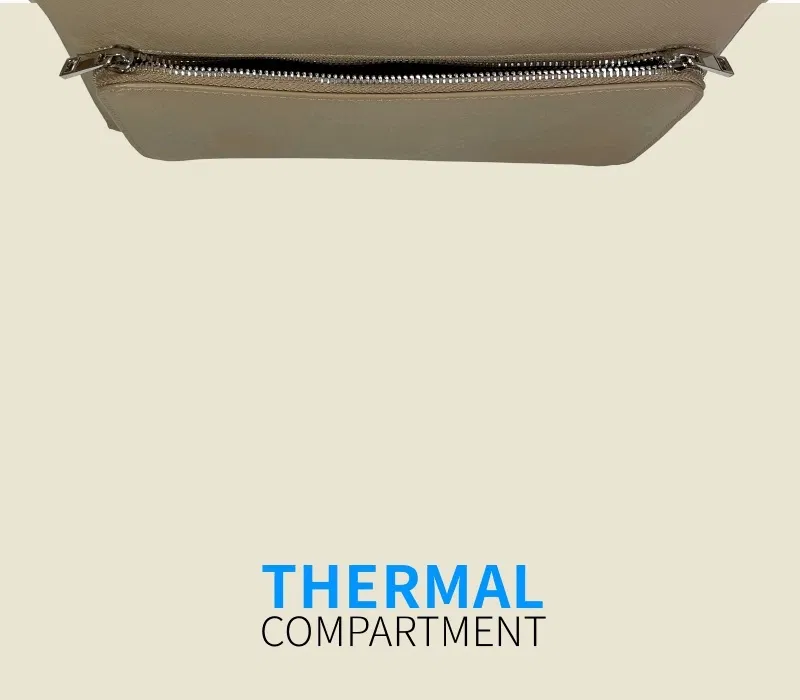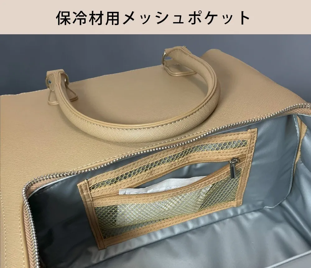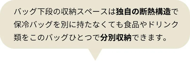 下段の保冷保温スペースは、断熱素材のEPE,PE,PETを使用し、表面は水分を弾き、見た目にも品のあるPVCで2層構成で製作しています。