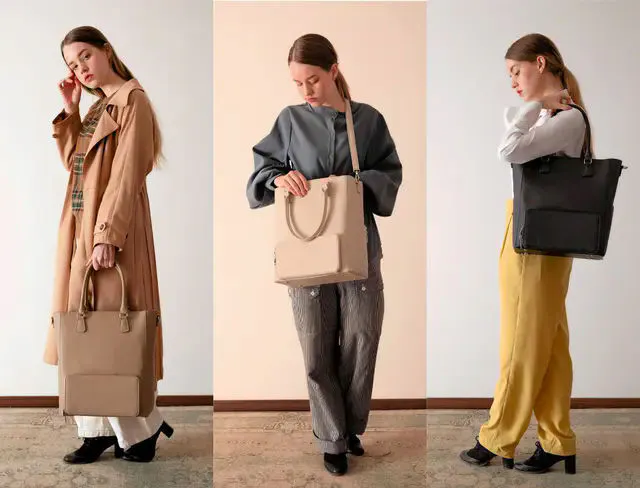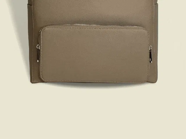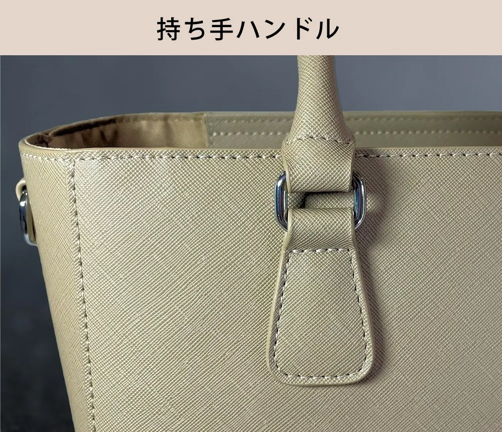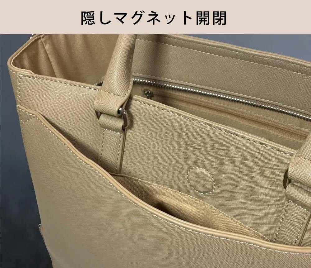 バッグ本体のサフィアーノレザー調の合成皮革は、縦長2重構造の"FLOORTOTE vertical"にとてもよく合う素材です。 合皮がふにゃふにゃせずシルエットをキープしたいデザインバッグに向いた素材です。 細かく上品なシボの型押しは、擦れに強く、高級感もあり、傷が目立たず、撥水性がある素材です。