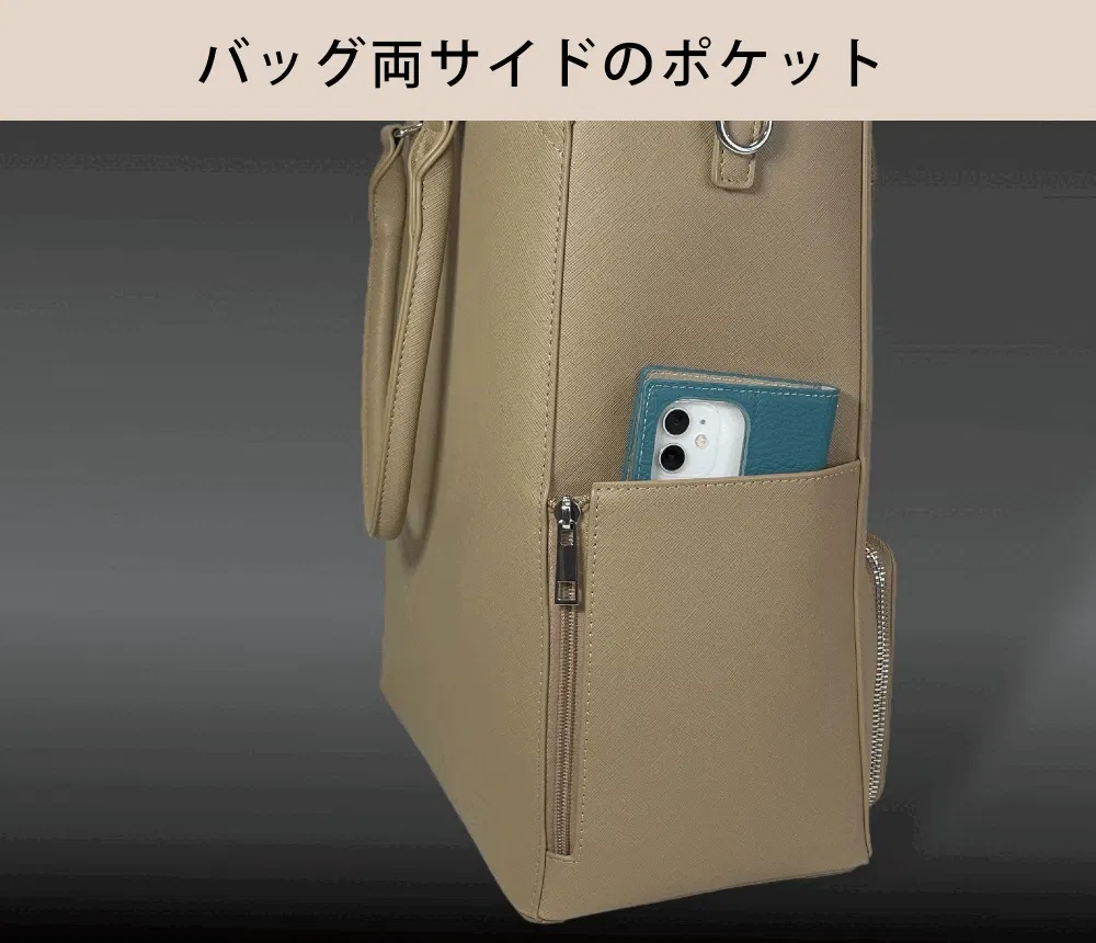 バッグ両サイドには、マチ入りポケットを付けました!