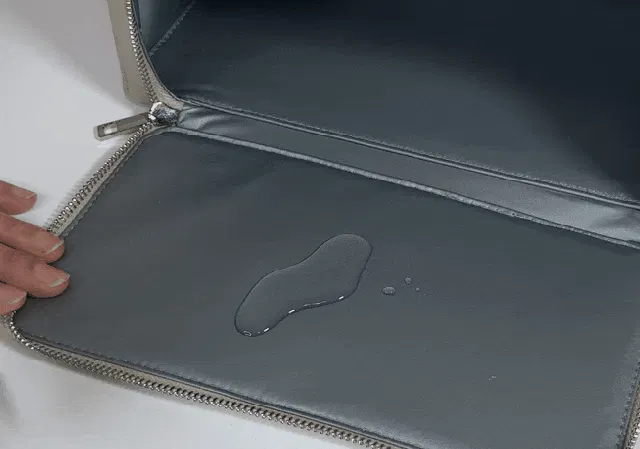 素材の特性上、ご覧のように水を弾くので、ワインなどバッグにこぼしてしまった時もサッと綺麗に拭き取れます。