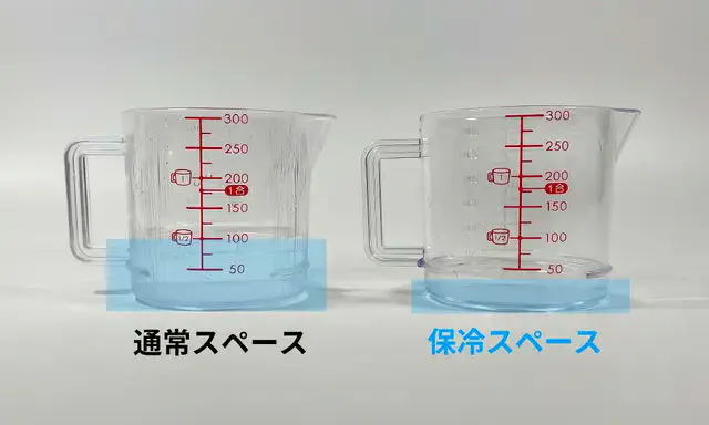 上の画像は、氷が溶けた水の分量を計量した結果です!上段と下段では明らかに氷の溶けるスピードに差があることがわかります。この検証は、保冷剤は未使用で実施したので、保冷剤を使用した際は、より高い効果が期待できます。