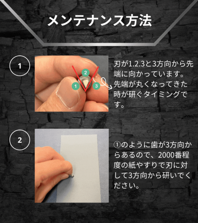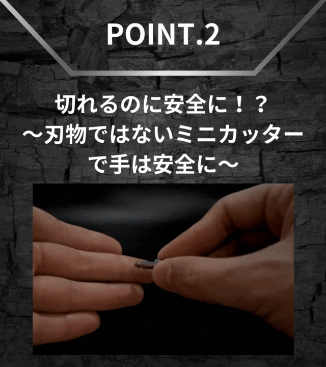 加工時に刃が鋭利にならないように特殊な三点加工が施されており、刃物として手などが切れにくいような仕様になっています。