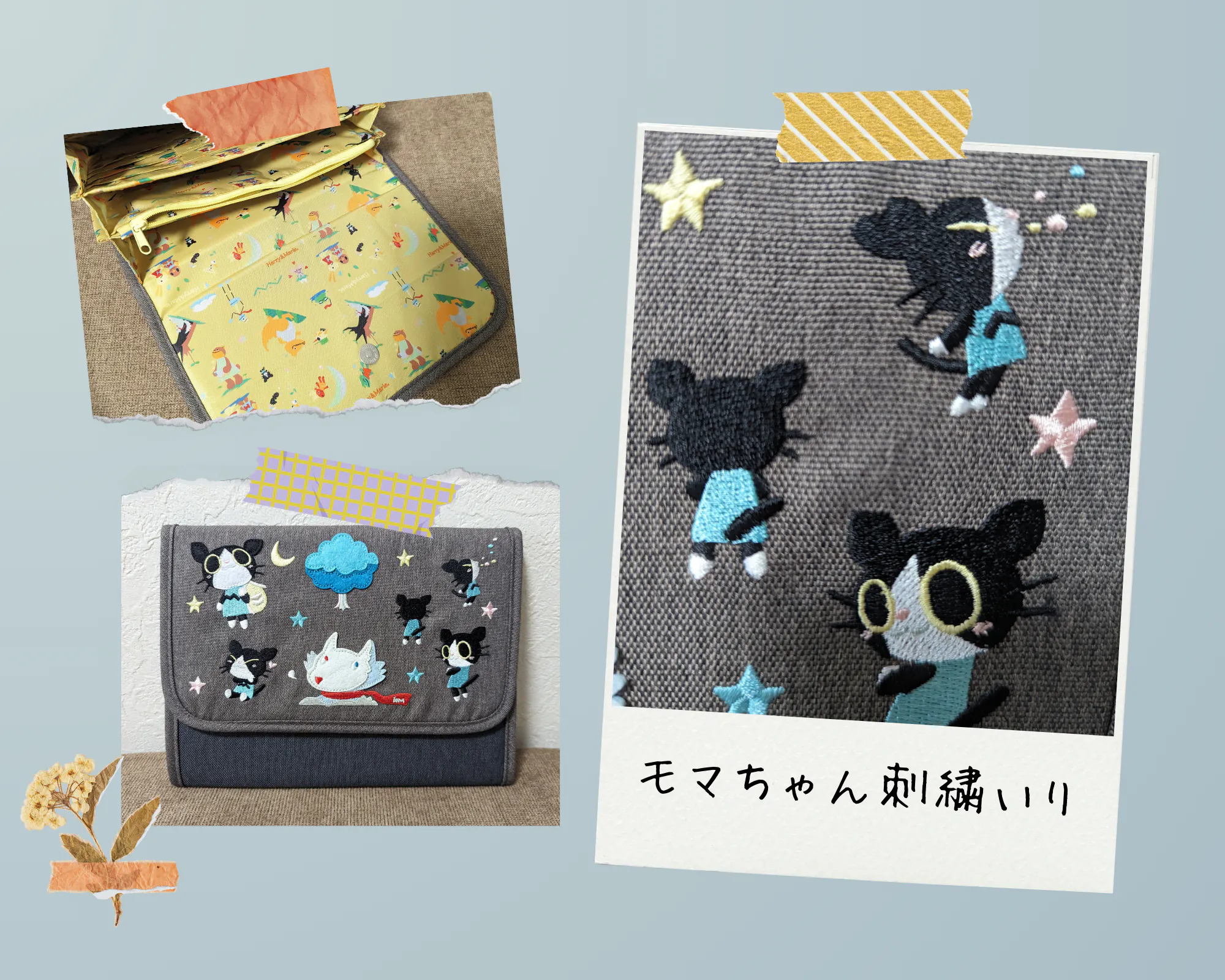 ポーチのイラストは、絵本に登場する「こねこのモマちゃん」が「おおかみのウォルフさん」のモノマネをしているかわいいイラストが刺繍になっています。中の生地もハリー&マリー柄でとってもかわいいです。