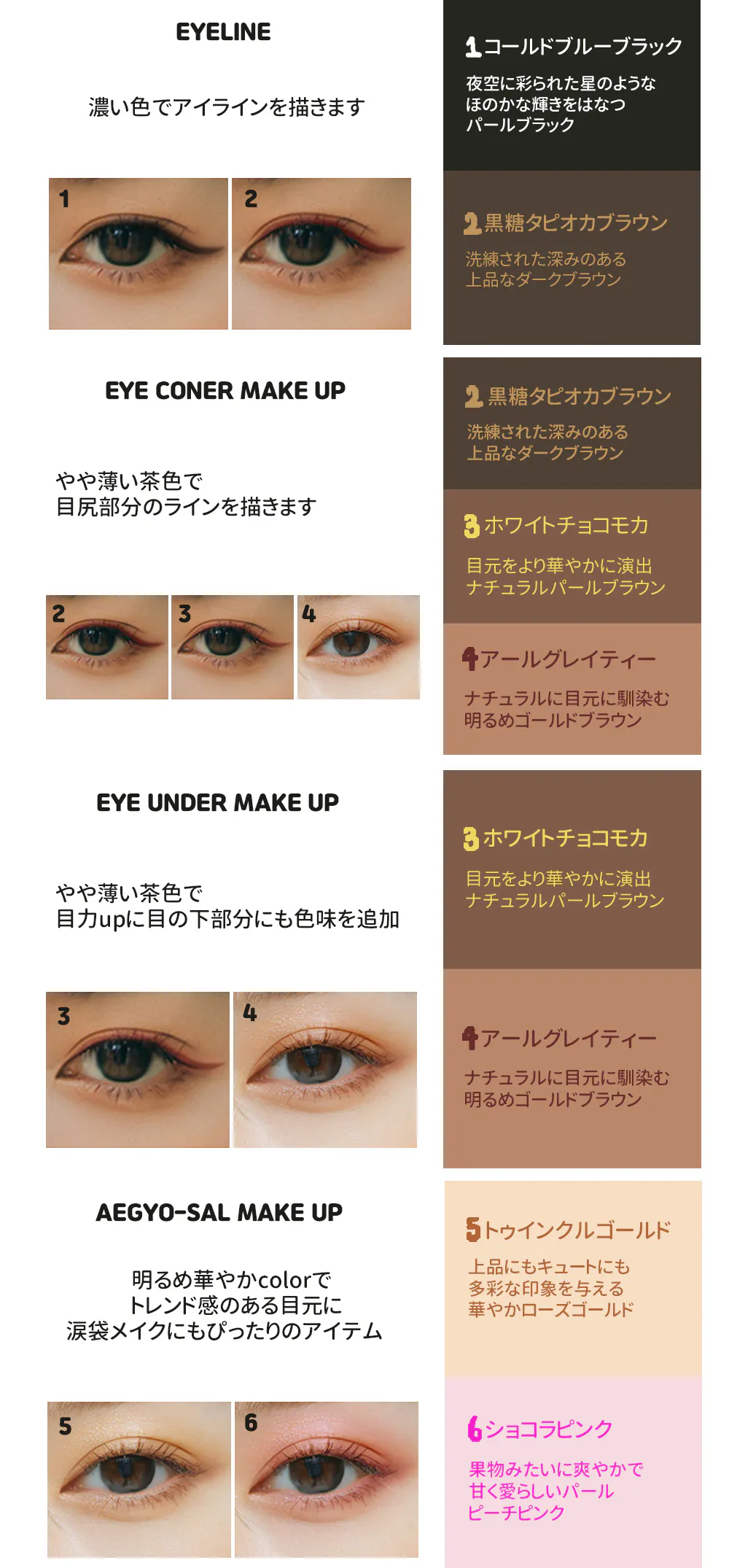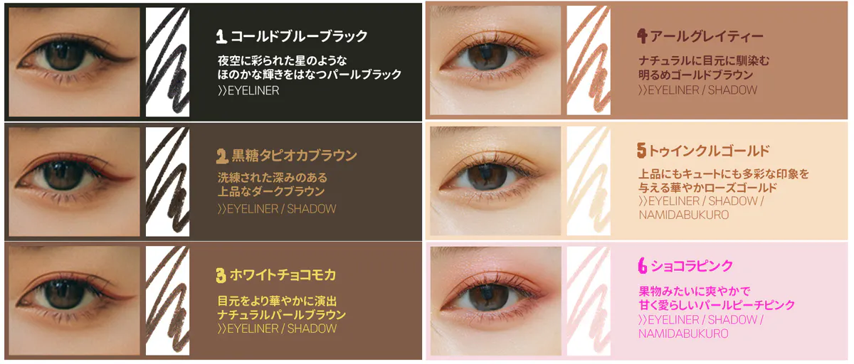 ②これひとつでアイメイク完結!アイライナ+シェドー全て使える「6色アイライナー」