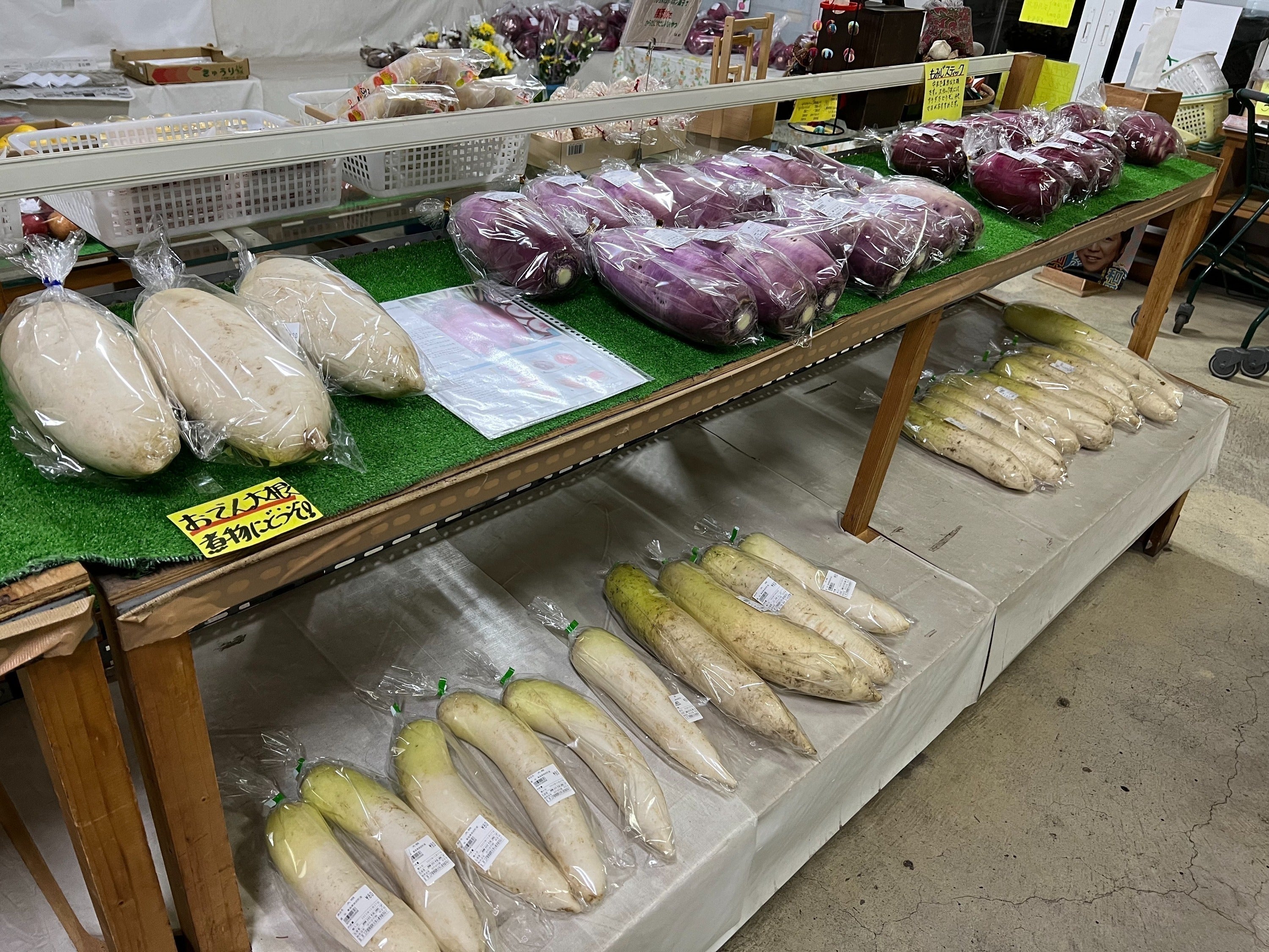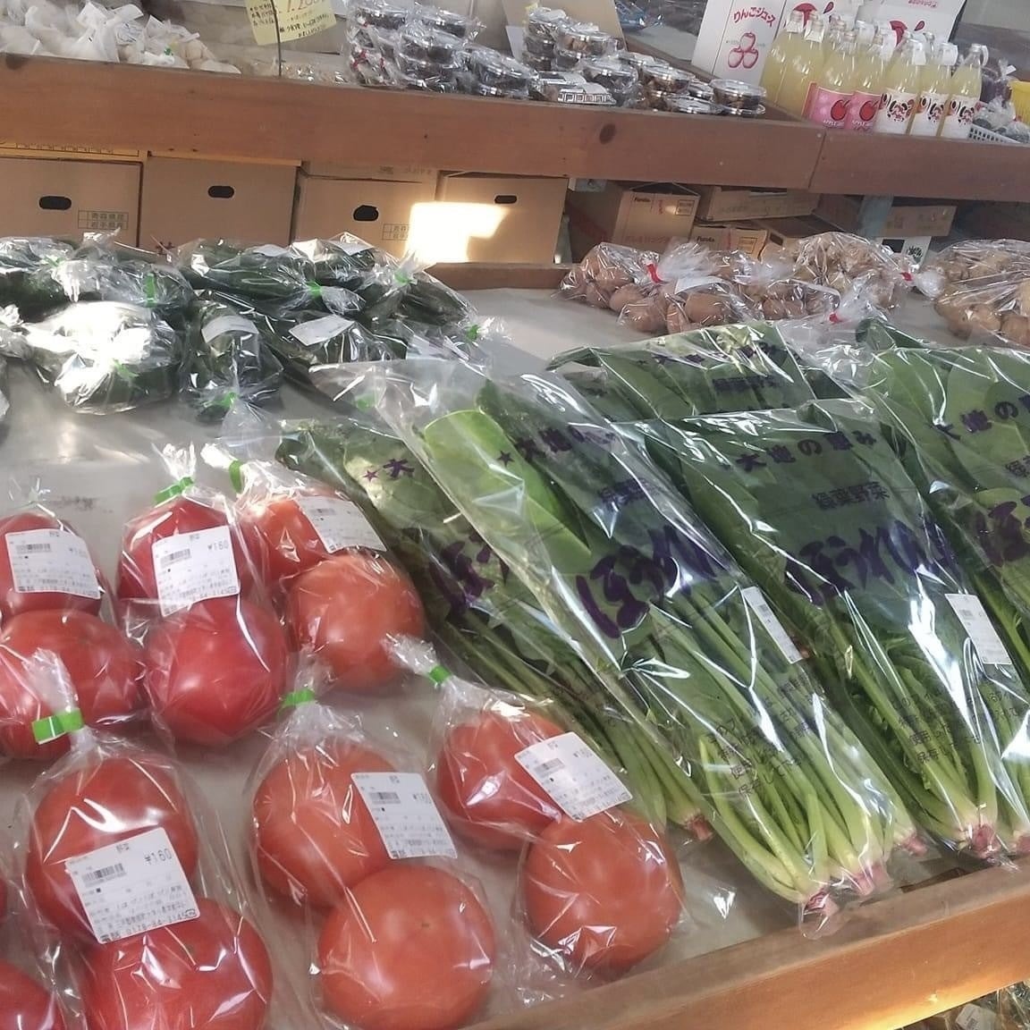 店頭に並ぶ商品は地元の生産者さんが作る、新鮮な野菜や果物が中心です。春にはふくだちやふきのとうなど緑豊かな野菜たちが並び、6月下旬には特産品の生にんにくやさくらんぼ、夏は国道沿いにありますので、ドライブがてらソフトクリームを食べたり、実りの秋にはお米はもちろん、りんごや桃、葡萄などの果物たちが続々と並びます。冬が近づくと大きなかぶや大根、白菜がごろごろ♪