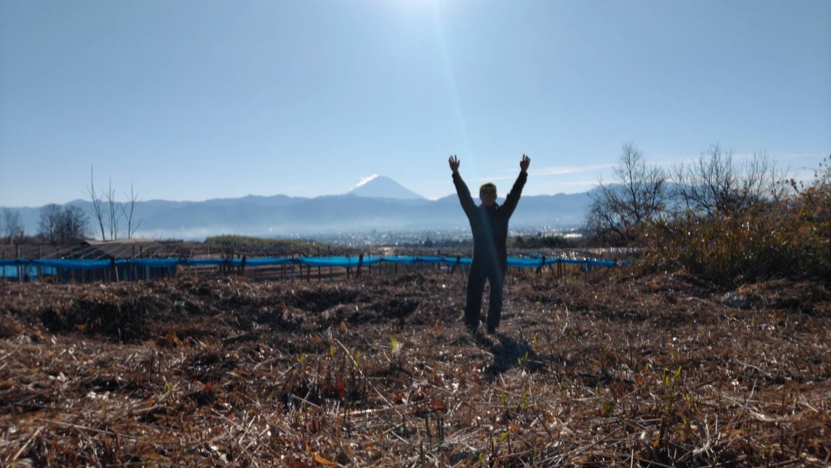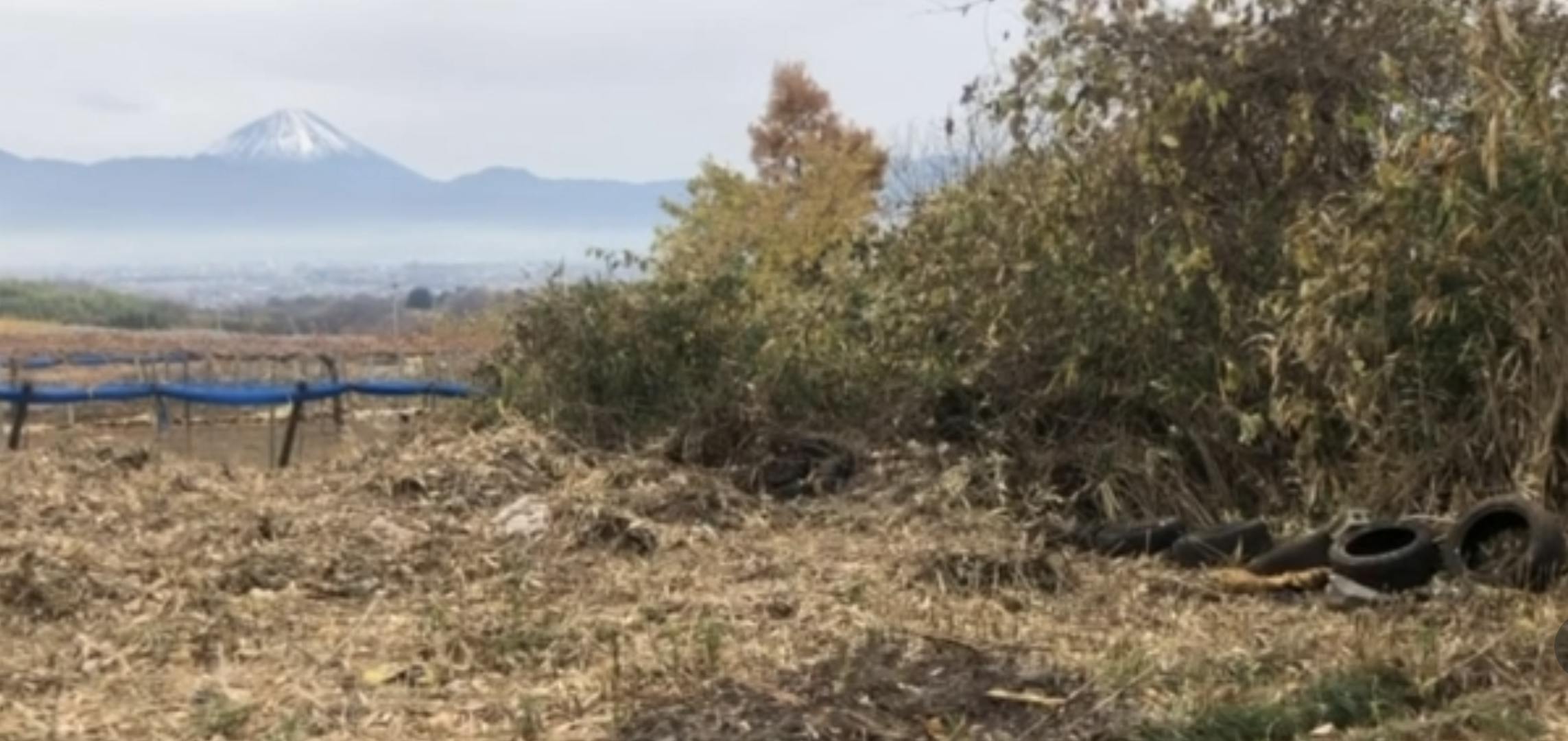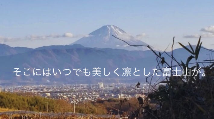 山梨は葡萄の名産地でもありワインも有名です。この土地の目の前にはワイン用の葡萄園も広がりその向こうには富士山が聳え立つ。