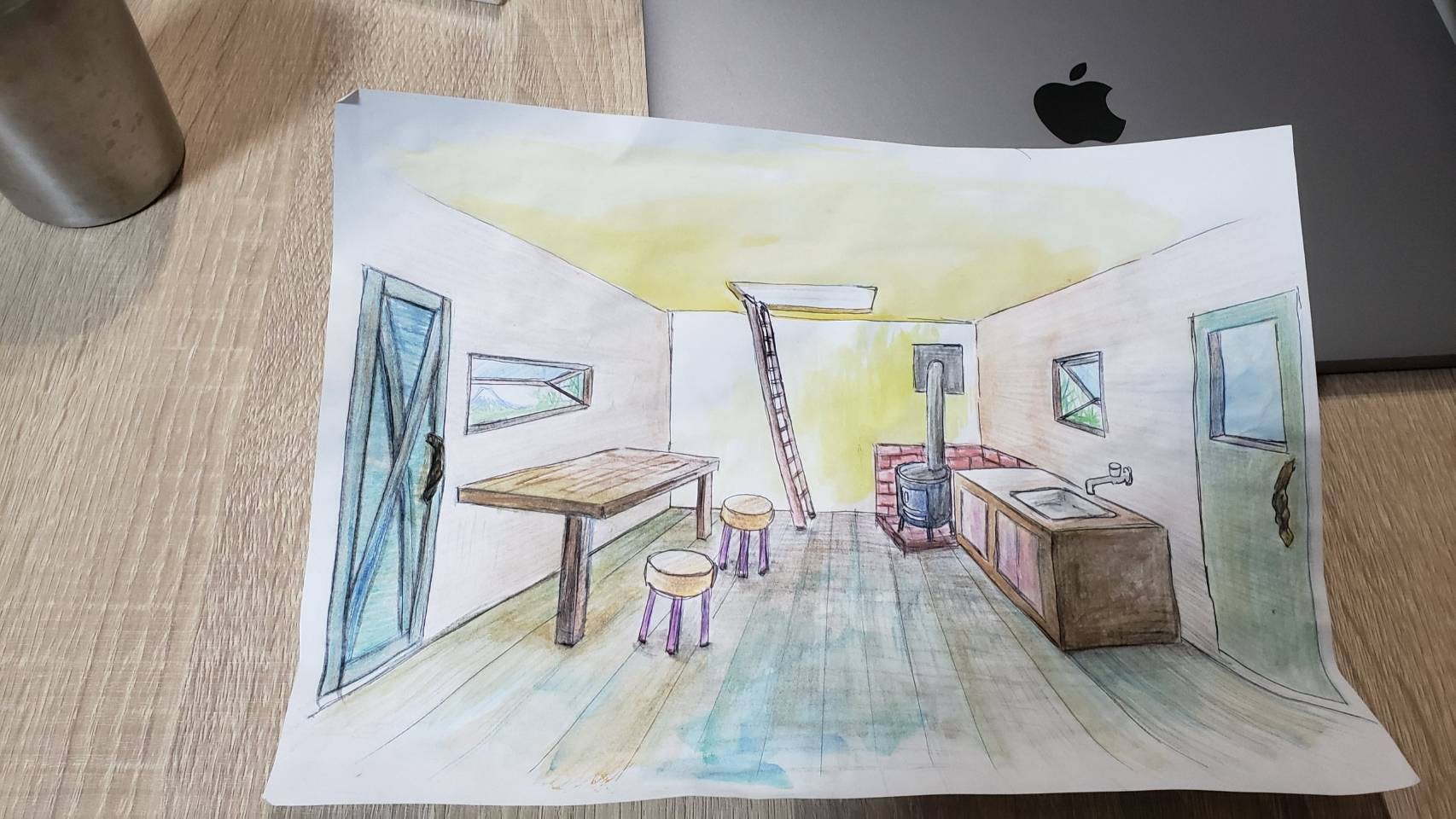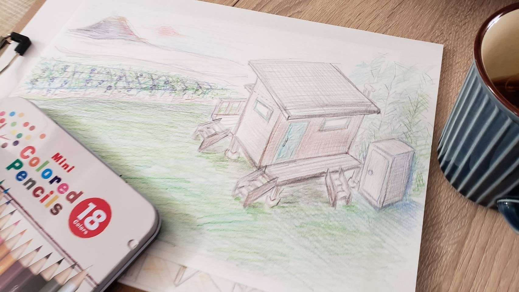 こんな山小屋を作りたいと絵にしてみた。図面なども引いた事もないのですが頑張って作ってみました。