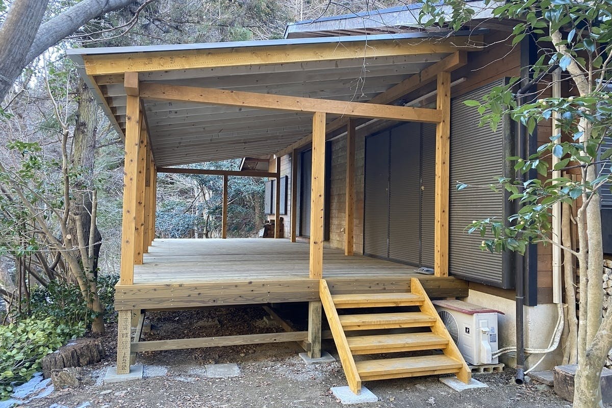 サウナの後のサ飯BBQ、寛ぎ時間のために、管理棟コテージにウッドデッキを増築しています。