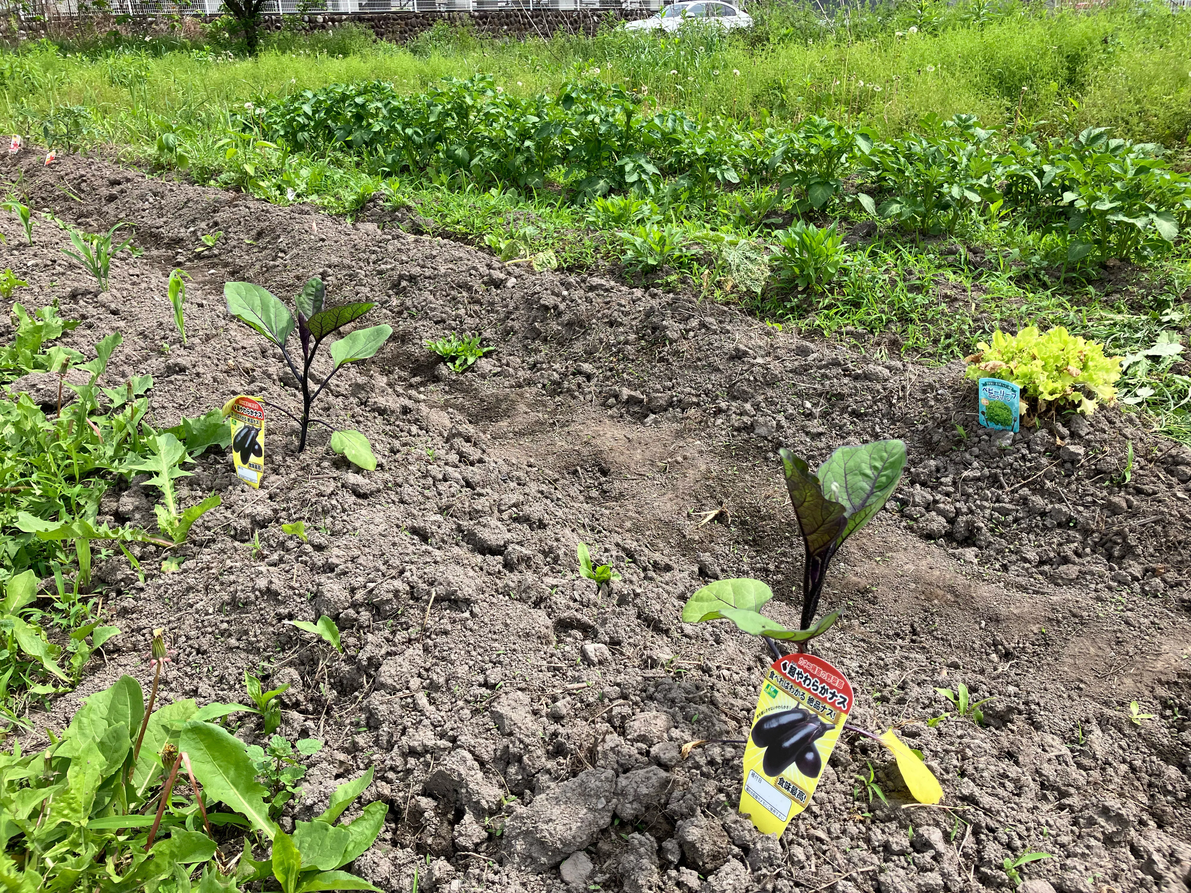 僕の祖母の畑を借りて育てている野菜(なす・じゃがいも・ベビーリーフ・きゅうり・トマト・とうもろこし)