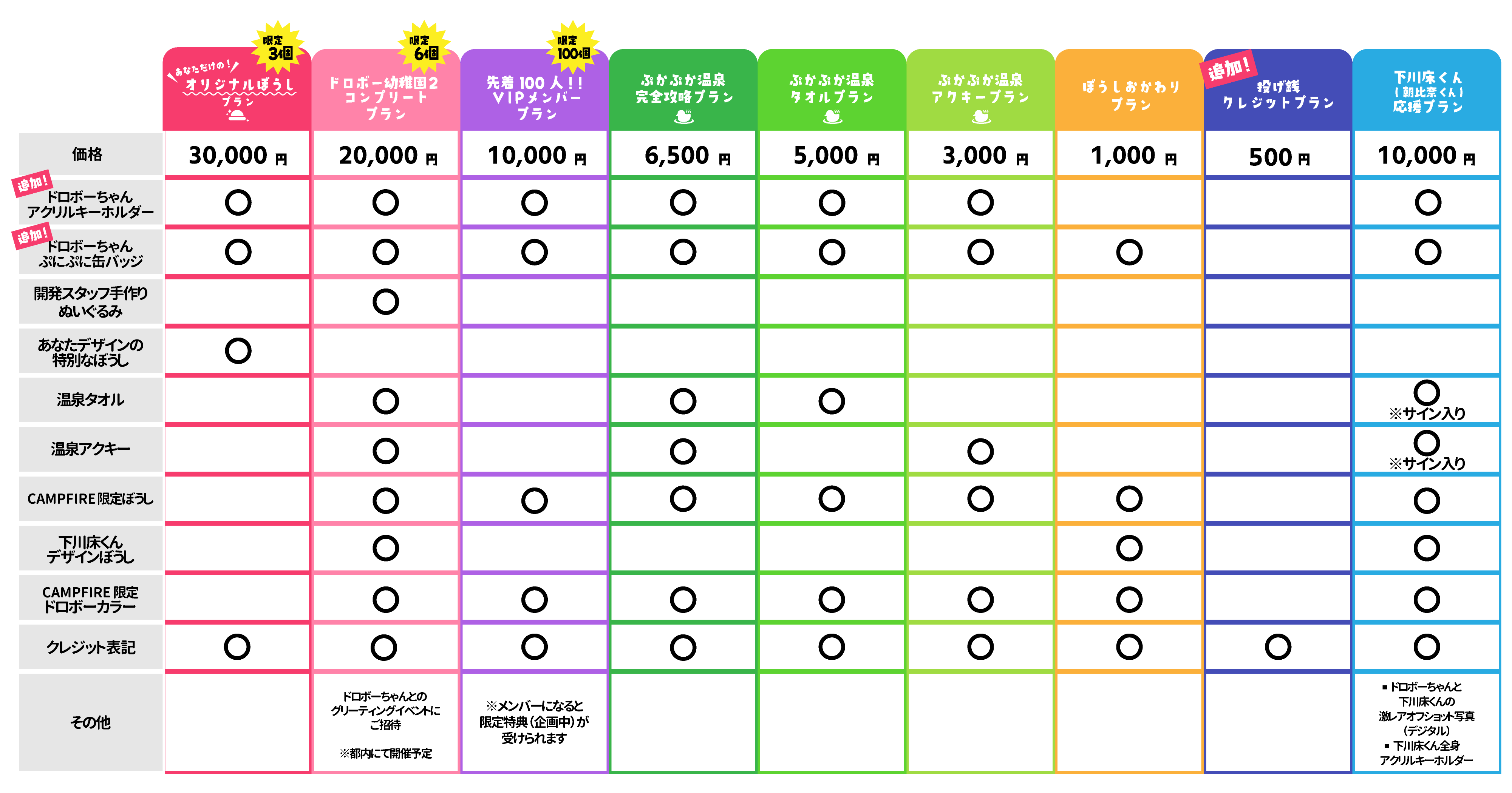 対象プラン:ドロボー幼稚園2コンプリートプラン、ぷかぷか温泉完全攻略プラン、ぷかぷか温泉タオルプラン、ぷかぷか温泉アクキープラン、下川床くん応援プラン