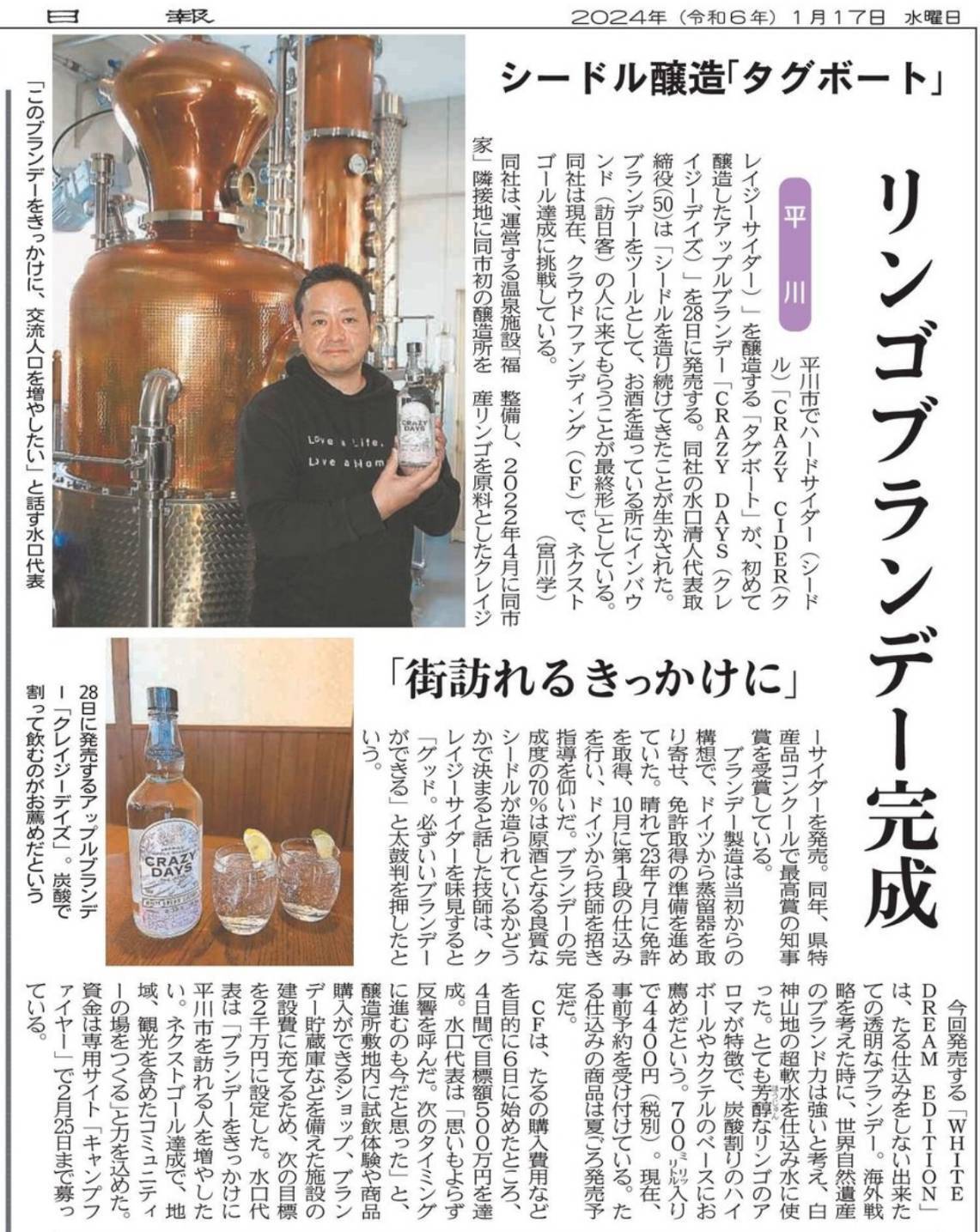 皆さんこんにちは。いよいよクラウドファンディングの挑戦もラスト8日となりました。2000万円の挑戦ですが目標達成できるか否かは、これからの未来の青森県のりんご産業にとって極めて重要なポイントになると思います。今日は私がこのクラウドファンディングで訴えている地域の課題と解決策を簡潔に3点だけ記載いたしましたので、まだご支援に迷っている皆様はぜひご一読頂きますようお願い致します。課題① 青森県は日本国内最高水準の高齢化率で人口減少が止まらない。これに対して私は人口減少を阻止するために、アップルブランデーという「りんご酒事業」で魅力的な産業を構築し地域をリードします。今まで青森県の贈り物と言えば生のりんご、りんごジュースが定番でしたが、いよいよ「時」の経過が価値を生むアップルブランデーがギフトになる日が来ます。このクラファンで皆様に応援頂き熟成樽を増やして、どんどんアップルブランデーを作らせてほしいとお願いをしてまいりました。この樽の中のブランデーは青森県の未来です。課題② 地域を支える魅力的な産業が少なく、若者はどんどん首都圏に流出してしまう。これに対して、私はイケてるりんご酒メーカーになり、労働生産性を上げ首都圏と変わらない所得を得られる若者を増やします。りんご酒事業にデジタルを駆使しIT・DX等の専門分野の人材も青森県に増やします。農業も加工用りんご専用園地を増やし、小人力化&機械化で若者が稼げる農業にします。そんなカッコいいりんご酒メーカーになるためにブランディング費用を皆様に応援頂いております。すでにご覧いただいていると思いますが、世界に通用するクリエイティブです。このブランドは日本酒なら「獺祭」、ウィスキーなら「イチローズモルト」、そしてアップルブランデーなら「CRAZY DAYS」と呼んでもらえるメーカーになろうと産声を今上げました。長い旅ですが、100年先の青森県の未来を見ています。課題③ 青森県から世界を目指す大人が少ない。子供に夢や希望が少ない。青森県から世界を目指す挑戦を続けて、地方の若者に勇気や希望を与えます。皆さんにクラファンでお願いした世界の品評会(コンペティション)に挑戦する費用もお願いしてきました。必ず青森県から世界に通用するアップルブランデーメーカーになって、世界中のBARで利用されるようなグローバルメーカーを目指します。そして、青森県の子供たちが青森県からでも世界で評価を得られるんだ!青森県からでも挑戦しているカッコいい大人いるんだ!自分も出来るはず!と勇気や希望をもってほしいのです。地域の子供たちは、地域の大人が背中を見せて育てたいのです。この3つを実現させたいという強い思いで、皆さんに訴えてきました。最後になりますが先日、あるウィスキー工場に勉強に行ってきました。そのウィスキー工場は地域になくてはいけない産業となり、地域を支え牽引しています。ウィスキーにかけた先人の愛情や信念を、今の人たちが大切に継承されています。改めてこんな素晴らしい産業を、青森県にも作りたいと強く思い帰ってきました。先人の150年かけて大事に育てたりんご産業を大切に守り、そして私たちの手でこれからの150年の青森県のりんご産業を一緒に築いていきませんか?この2000万円の目標達成は、私が5年で成し遂げたいと思った地域の未来を、一気に1年に前倒し出来るかどうかの重大なポイントです。どうか私に皆さんのお力を結集させてください。皆さんのご支援が、地域の未来でもあり、地域の子供たちの未来を作ることになります。どうか、ラスト8日となりました。まだご支援されていない方は、何卒応援よろしくお願いいたします。 CRAZY DAYS 代表 水口清人