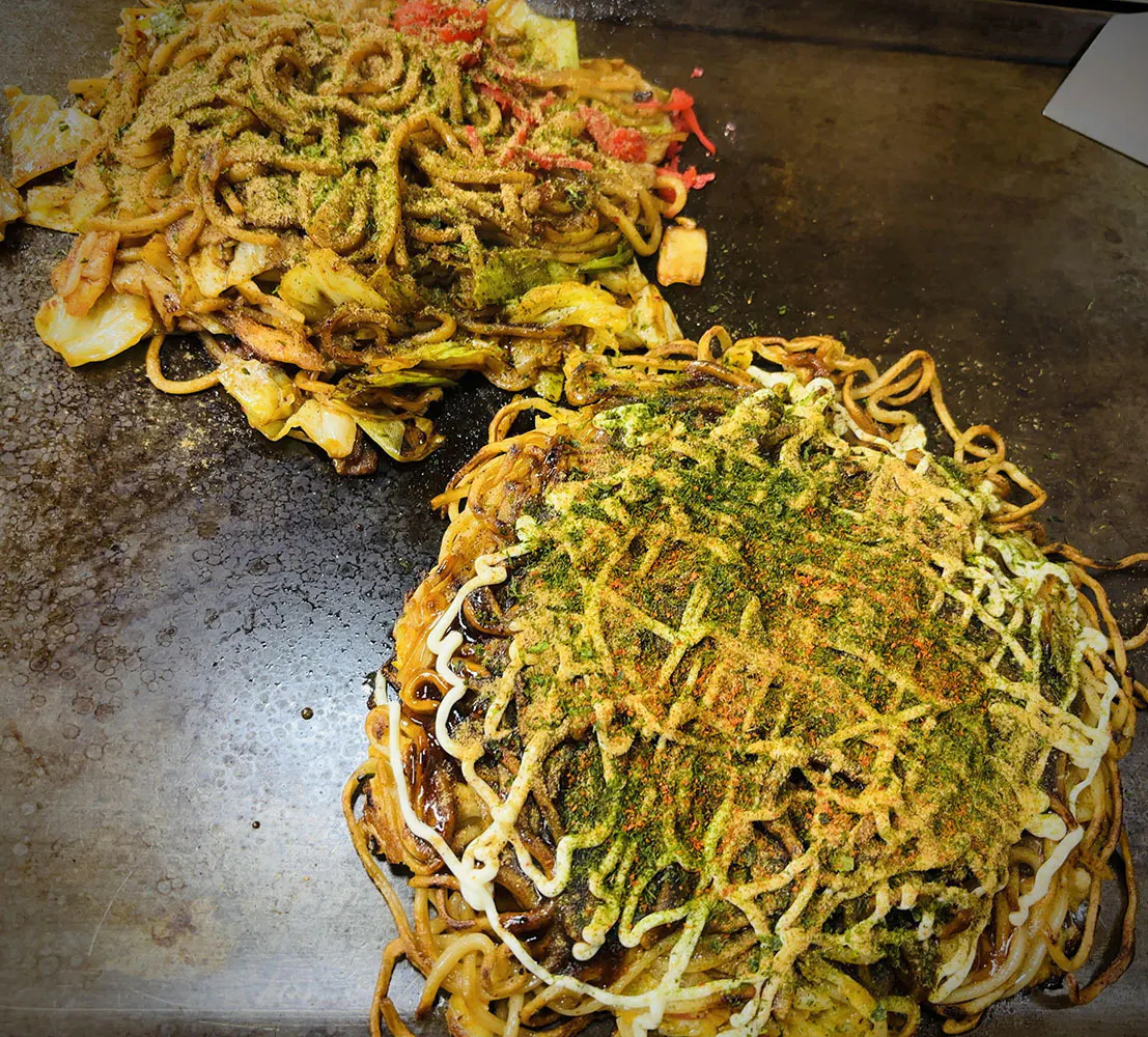 熱がりながら食べるのがお好み焼きの醍醐味(笑)僕が頼むのはいつも「イカ豚モダン」妻はこの日は「キムチ焼きそば」焼き具合も最高なのです!