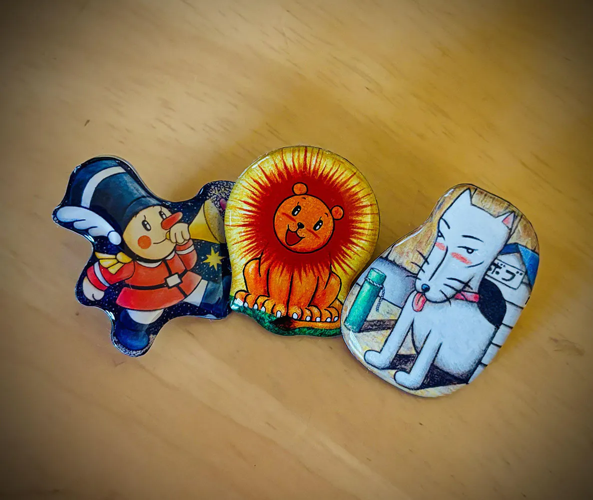 来場者プレゼントもありますが、今回、会場にて商品、作品を500円以上お買い上げ頂いたみなさまに徳治昭童画館オリジナルピンズをプレゼントいたします!