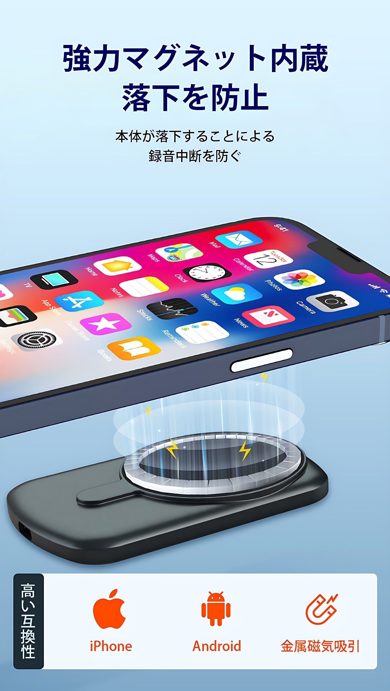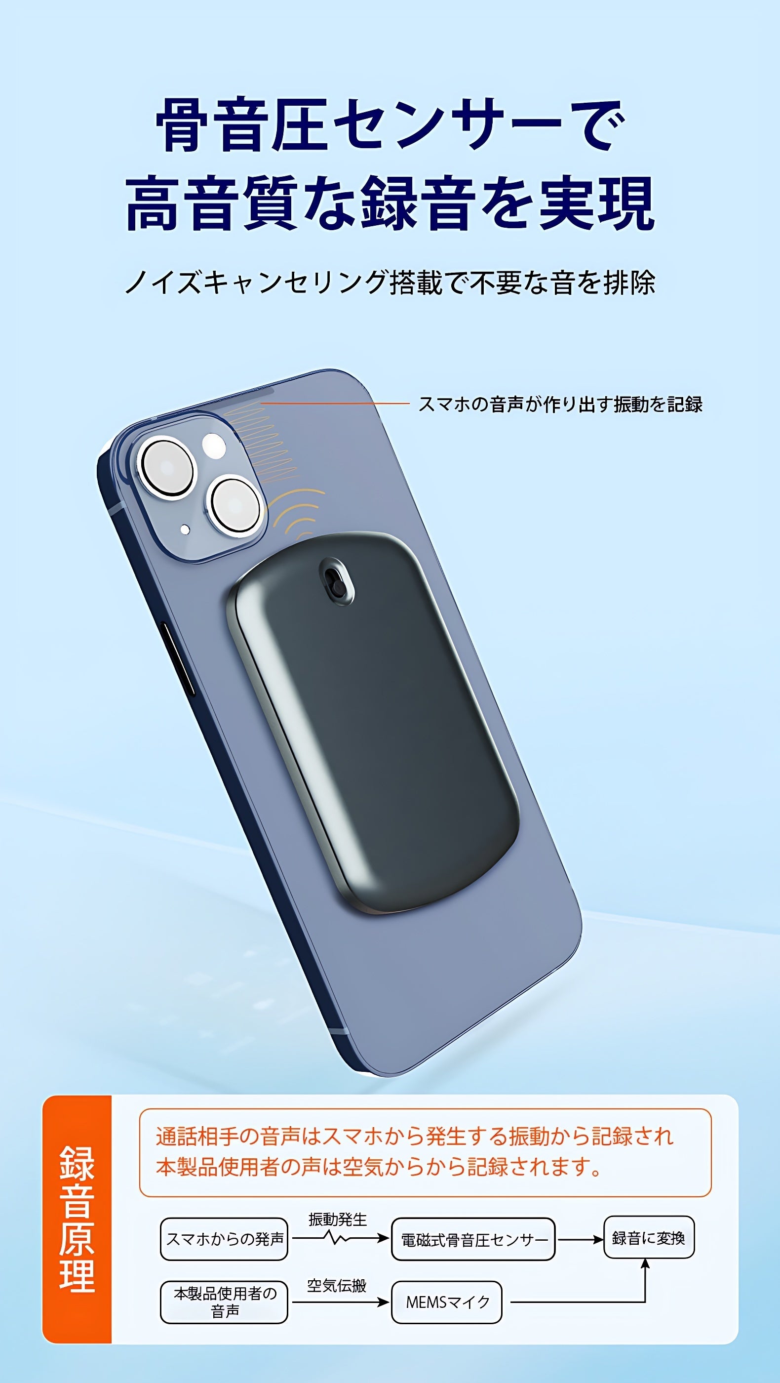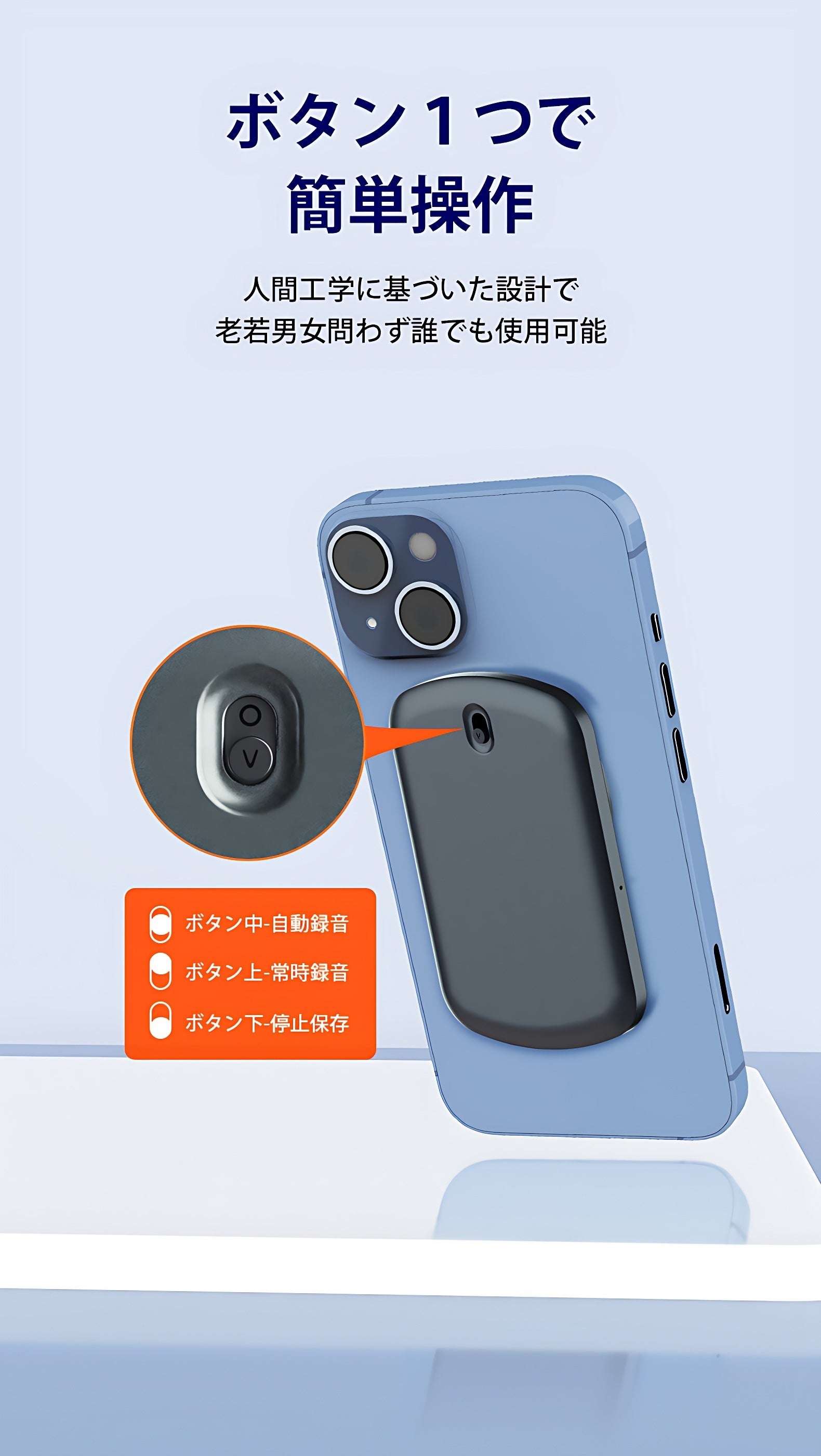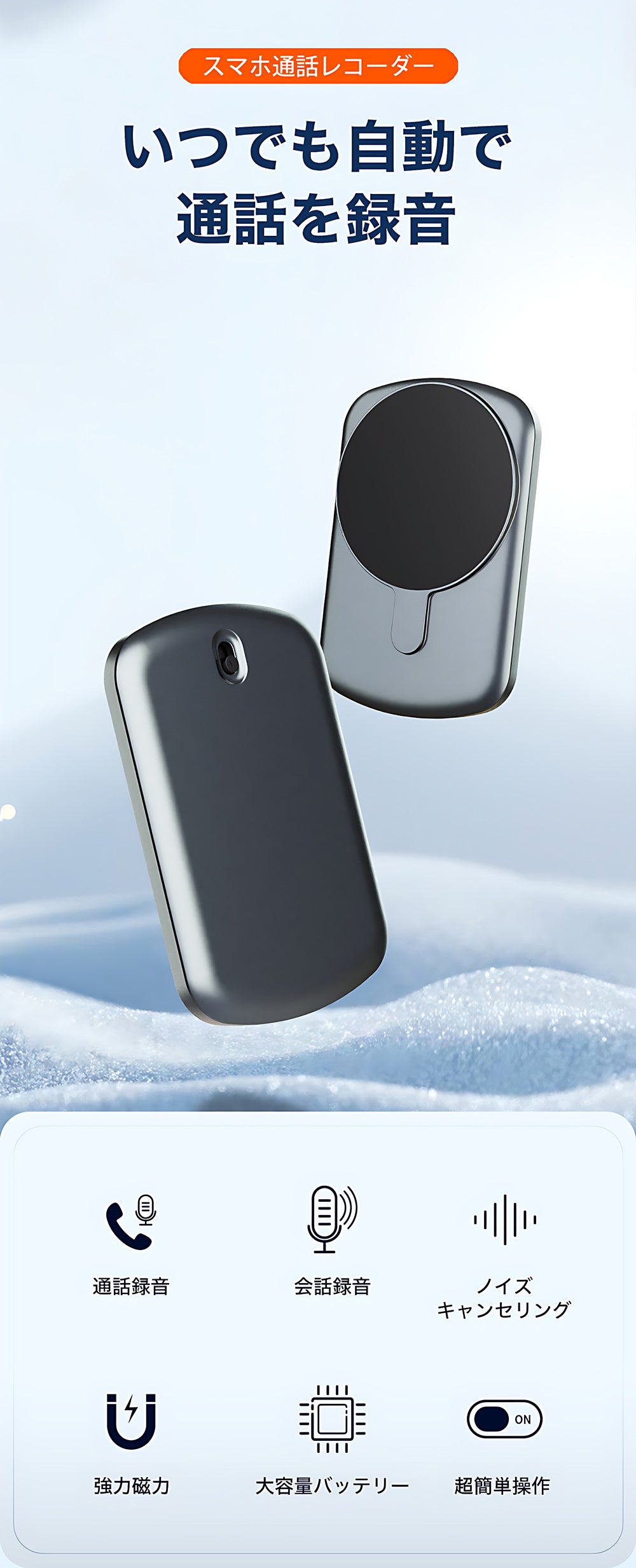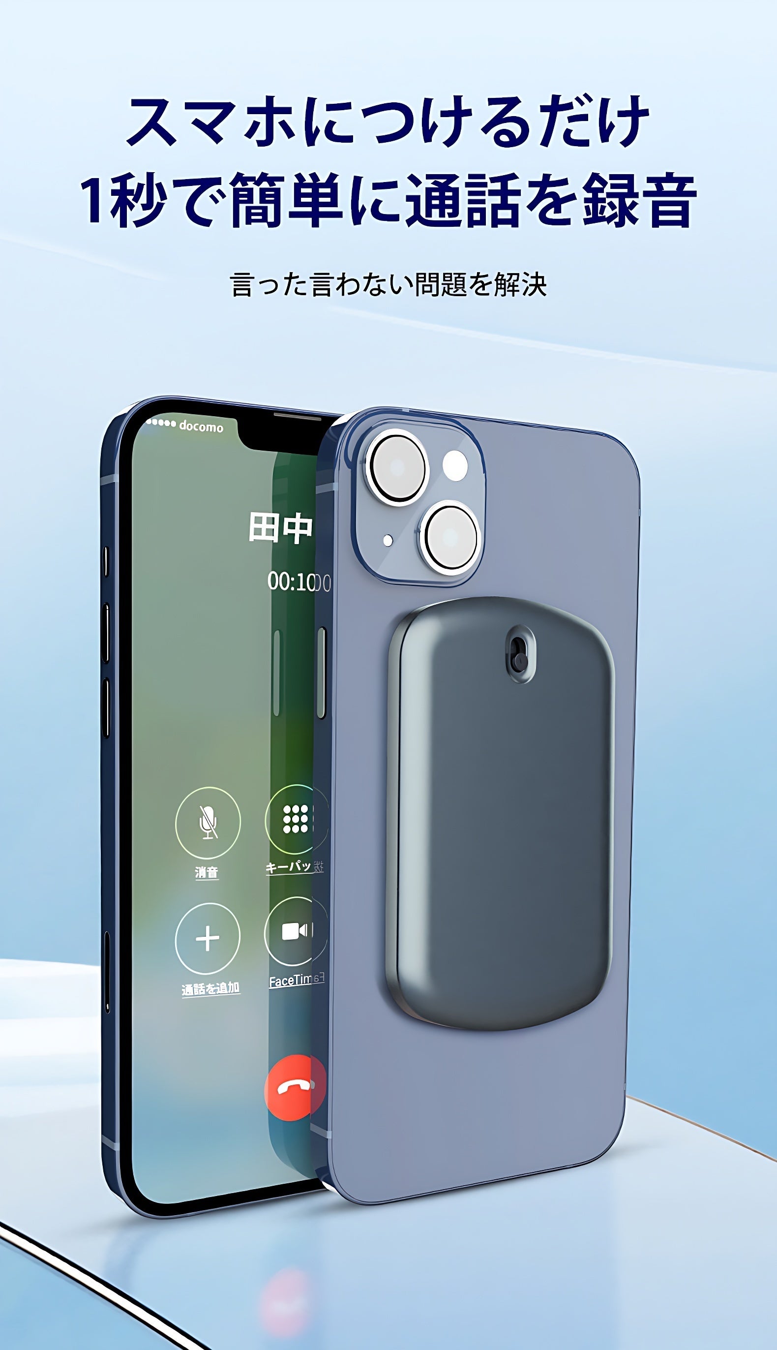 本製品はスマホにくっつけるだけで簡単に、1秒で通話を記録できます。