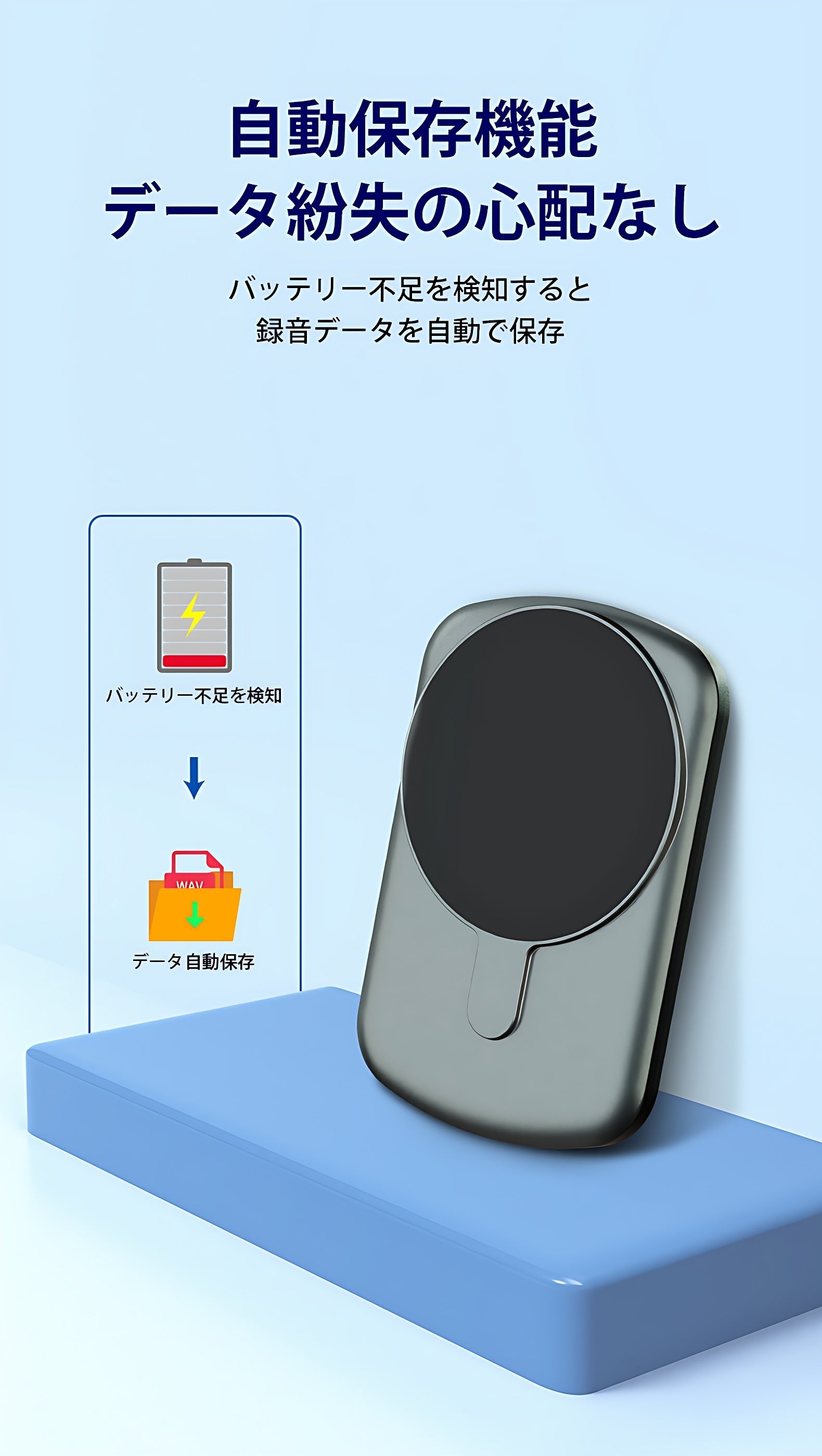 バッテリー残量が少なくなると録音中のデータも自動で保存するため、充電切れによってデータを紛失する心配はありません。