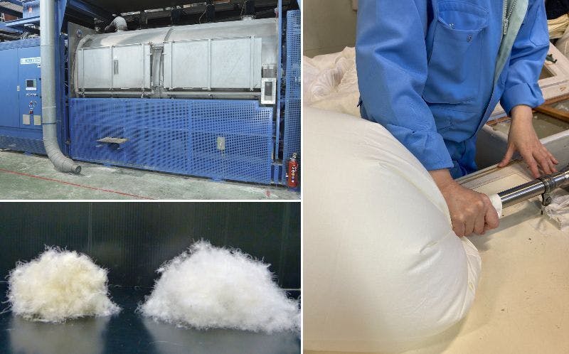 羽毛の洗浄前後のイメージです。ホコリやゴミが取り除かれ、カサも増しています。(今回使用している羽毛ではありません。)