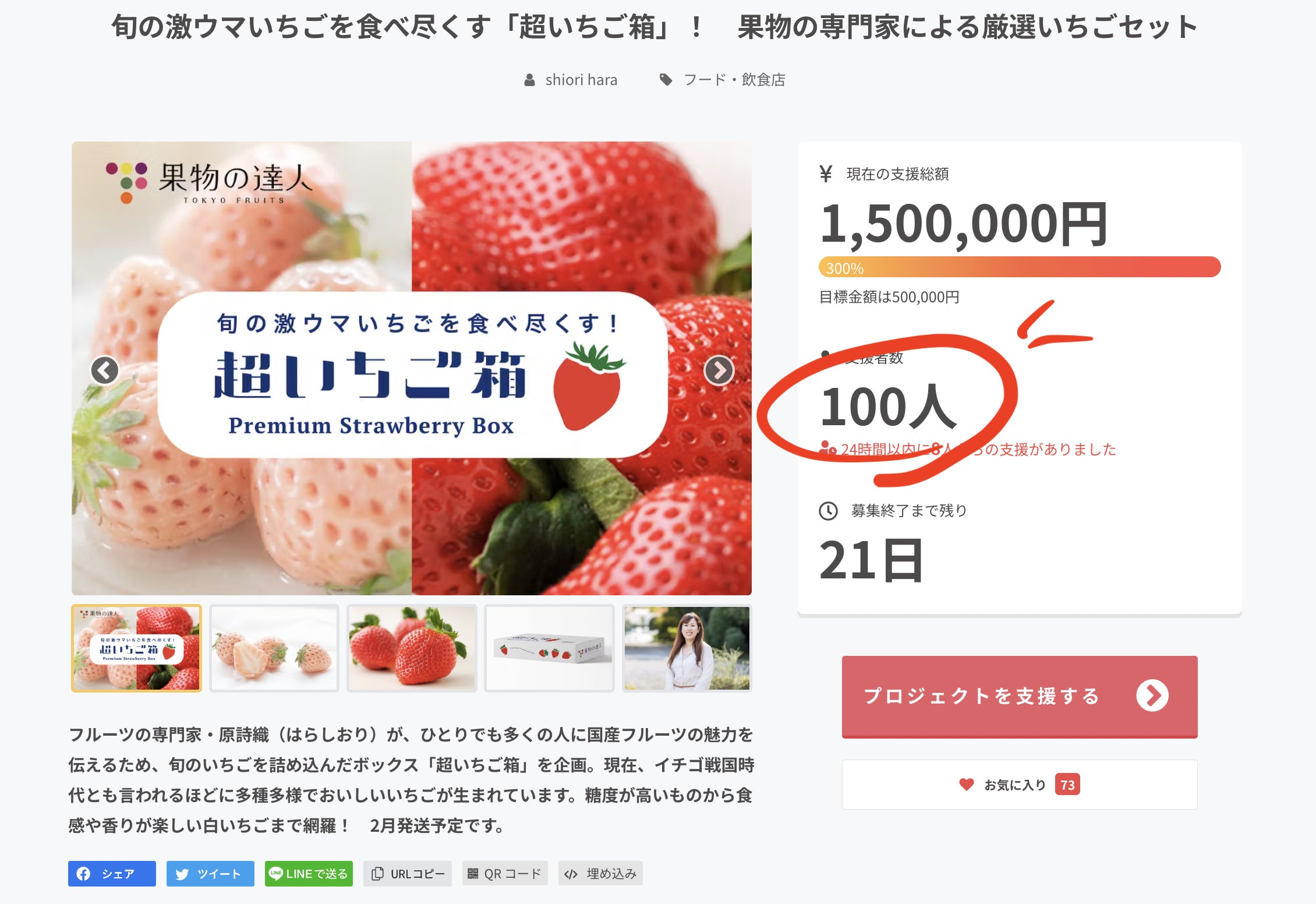 「超いちご箱」なんっと!100名の方にご支援いただきました!!「超いちご箱」はこちらめちゃくちゃ嬉しいです!100名の方に超かわいい「超いちご箱」が届きます!どんなイチゴを入れるか本当に楽しみです。「超いちご箱」はイチゴだけではなく、いちごをたくさん楽しんでもらえるように、イチゴの読み物を一緒にお届け予定です。ただ食べるだけではなく、イチゴの歴史やおいしさ、イチゴにまつわる小話などを盛り込んで、イチゴについて色々と楽しんでもらえたら嬉しいです!「超いちご箱」は1月31日(水)までの締切となります。引き続きご支援・応援をよろしくお願いたしいます!!
