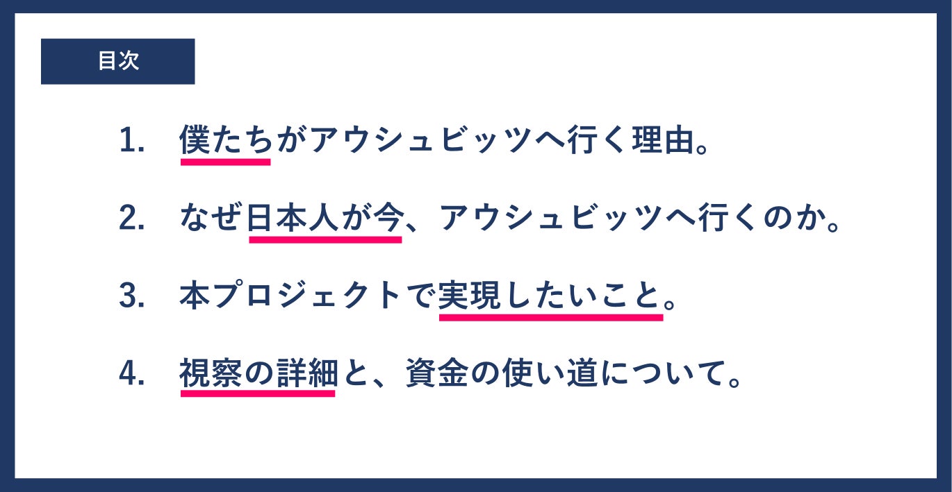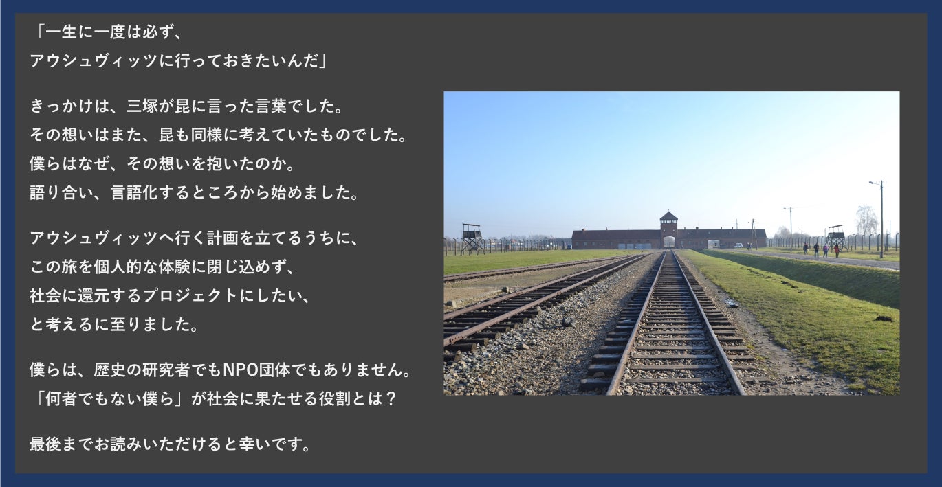 僕たちが「今、アウシュヴィッツに行くこと」は、部外者の参入という側面の他にも、日本人がアウシュヴィッツへ行くハードルを下げる、という副次的な効果もあるかもしれない。その可能性に気付いたとき、この旅行を個人的な体験に閉じず、社会に還元するプロジェクトにしたいと想うようになりました。