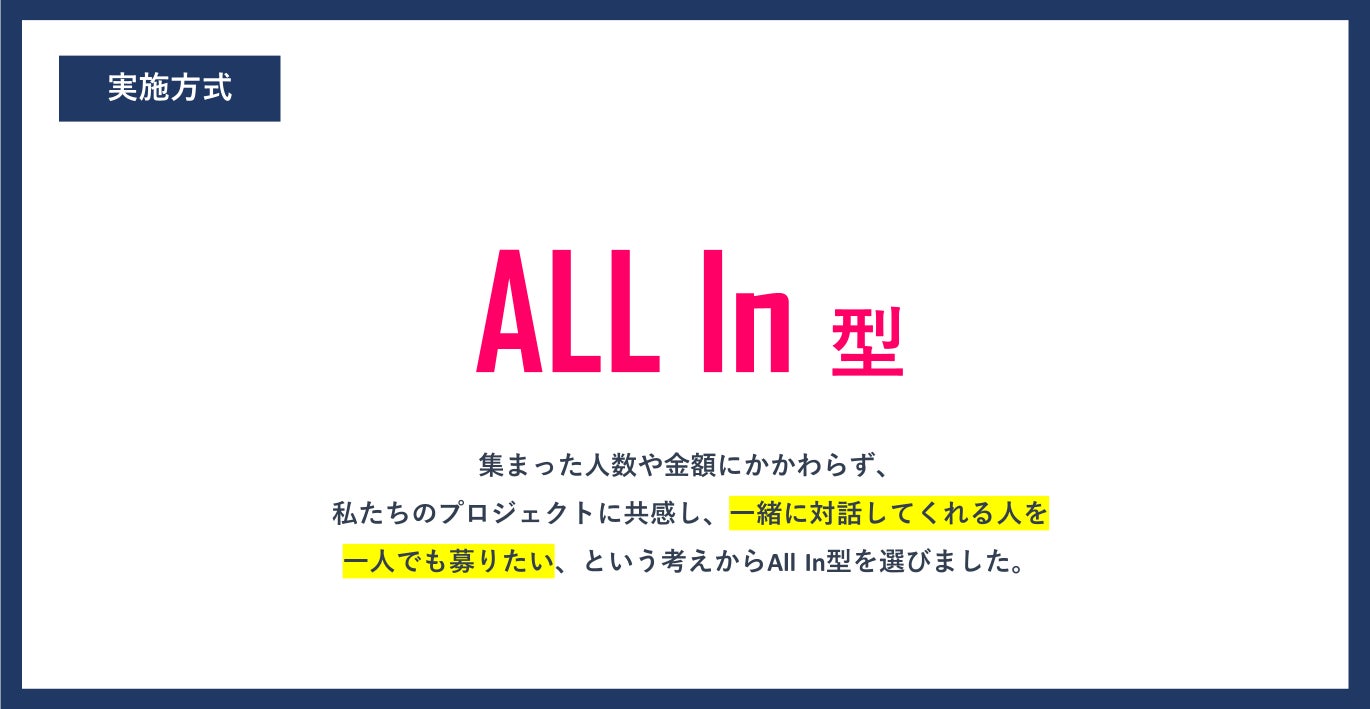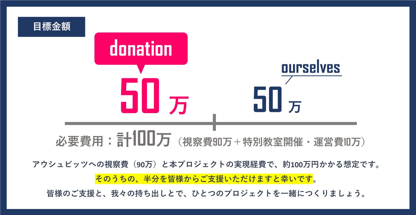 目標金額は50万です。今回、All in型を採用しました。僕らは目標が未達の場合も、実際に視察を行い、一人でもご支援いただける方がいらっしゃれば、特別教室の開催をいたします。最終的な人数や金額が目的ではなく、一人でも一緒に対話をしてくれる人を、賛同してくれる人を募りたいという想いから、このプロジェクトは設計されています。何卒よろしくお願いいたします。