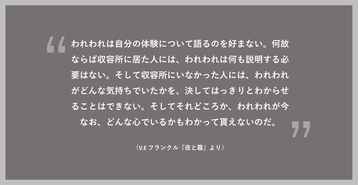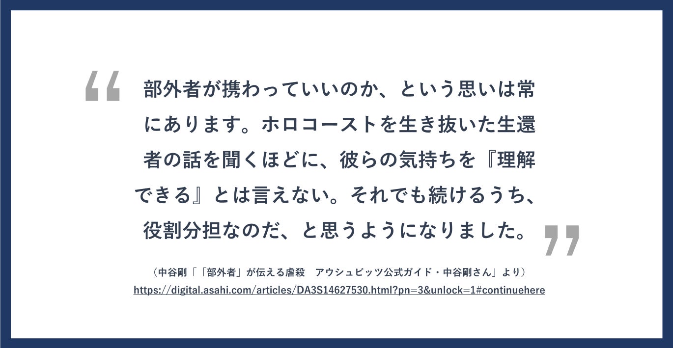 確かなことは、いずれ、本当の意味での当事者がいなくなるということです。加害者が消え、被害者も消え、後には歴史のみが残ります。確実に、遠くない未来の話です。ポストトゥルースと歴史修正主義の時代、僕らは、それでも、語らなければならないはずだと考えています。ホロコースト自体、世界における歴史修正主義の問題の中心でもあるからです。