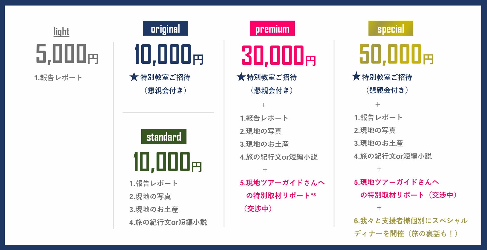 本プロジェクトは「特別教室」の開催の対話を中心に、基本リターンとして、今、僕たちができる発信の実践として、充実したコンテンツを用意したつもりです。そのため、寄付額に対し、返礼としてなるべく見合う範囲でのプランをと考え、設計いたしました。