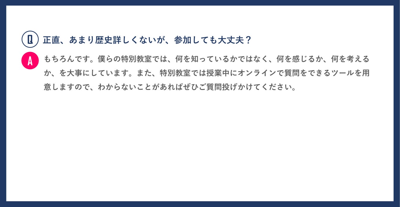 僕たちのプロジェクトに共感し、支援してださった方とかえつ有明の生徒で、対話をベースにした特別教室を開きます。対話を重視する本校で、単に歴史を知ることの先にある、創造的空間を一緒に作りたいと思っています。
