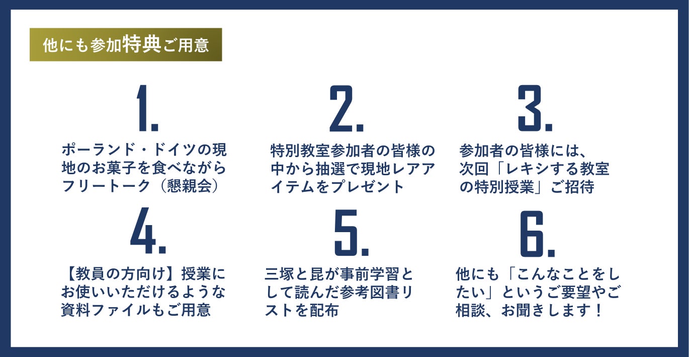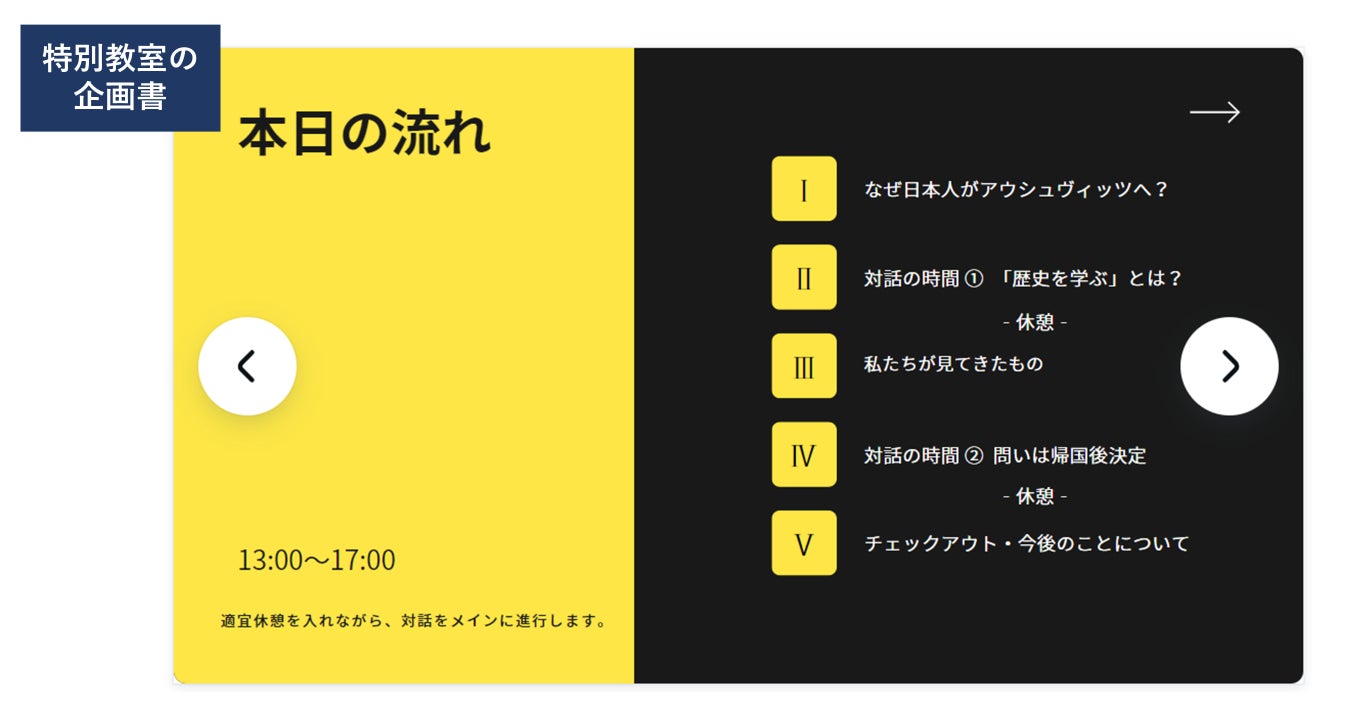 本プロジェクトはあくまで「我々がアウシュヴィッツを訪れた上で、子どもから大人まで交えた特別教室を開く」プロジェクトです。しかし同時に、このプロジェクトが挑戦の第一歩となるような構想も考えております。資金調達の達成および本プロジェクトにより実施する「特別教室」が成功すれば、第2回、第3回とシリーズ化したり、より多くの人が参加できる枠組みを具体化していきます。その構想を、僕たちは「レキシする教室」と名付けました。少しだけ紹介いたします。