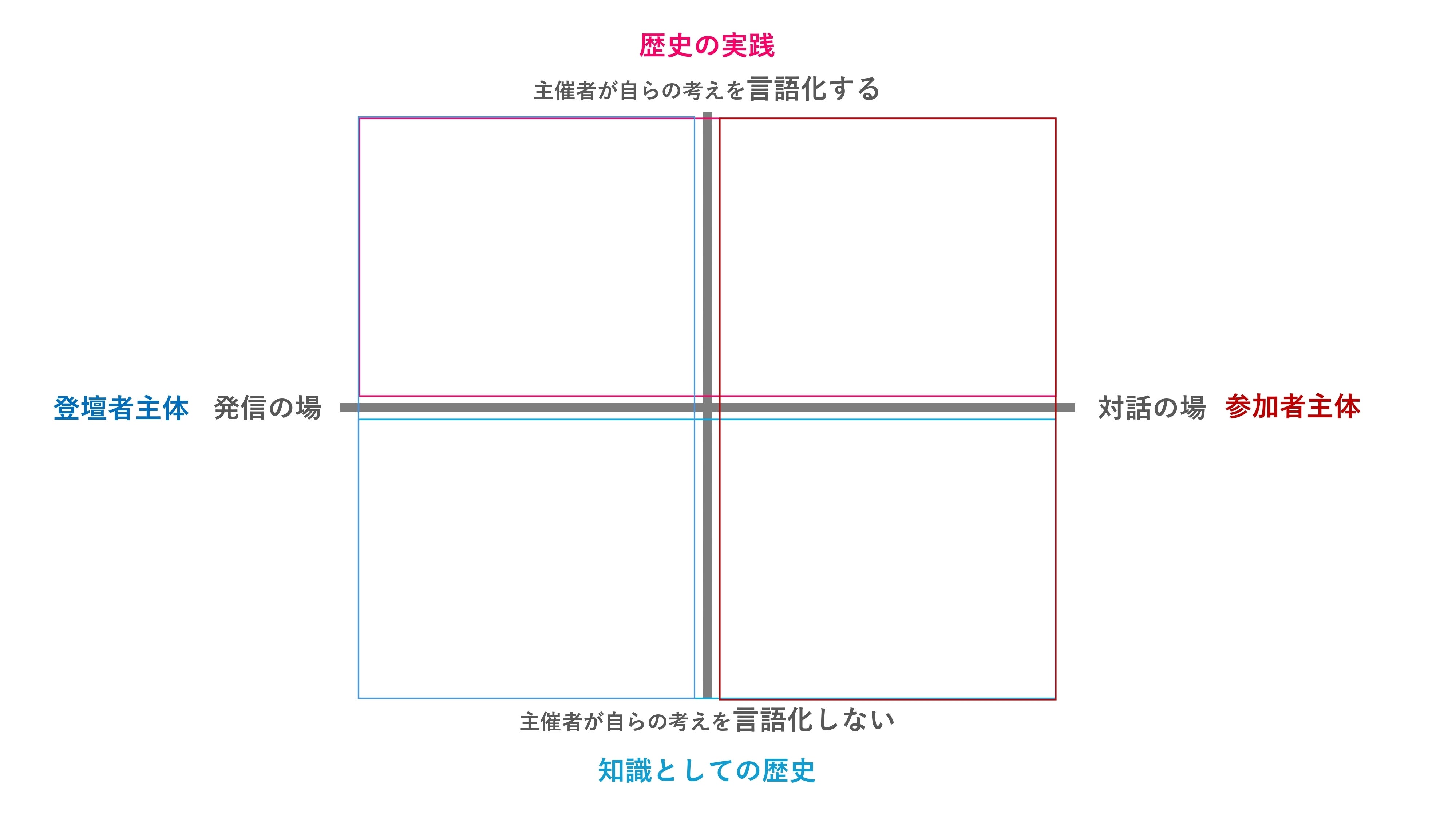 2024/08/04 21:00全四回を予告としておりました特別教室の活動報告の最終回【4.振り返り編】をお送りします。【1.設計編】【2.準備編】【3.開催当日編】を未読の方は、そちらからお読みいただけますと幸いです。特別教室、改めての感想 勝手もわからずノウハウもなく、限られた人的、時間的リソースの中で、最後までやりきることができました。参加してくださった方々が、参加する以前と以後で考えや気持ち、態度あるいは行動に、少しでも変容を起こせられたのではないか、と控えめながらも胸を張らせていただきます。至らぬ点も多々あったと思います。他方で、特別教室を開いたことが、参加してくださった方々の人生に少しでも良いきっかけを引き起こすことができたこと、そのことが歴史だったり、社会だったり、あるいは世界だったりを良い方向へ導くだろうこと。そう、信じられるような会にできたことが、ひとつの成果と感じています。 特別教室の振り返りは、一方では特別教室自体の振り返りでありながら、他方ではクラウドファンディングを通じたプロジェクトの全体、僕らがやってきたことすべての振り返りでもあります。ホロコーストとアウシュヴィッツについて学び、その上で特別教室を開催して、結果最終的に我々は何を考え、学び、得たのか。その全体の成果を踏まえて、我々は「この先」、どこへ向かってゆくのか。これまでと、これからの話です。 実は、本プロジェクトをクラウドファンディングとして公開した当初は無かった、あるタイミングに書き加えられた構想「レキシする教室」というものがあります。アウシュヴィッツへ行く数週間前、今回の特別教室の開催を単体で終わらせるのではなく、何かしらの形で持続させていきたいと既に考えていました。そのプロジェクトの構想の名が「レキシする教室」です。 アウシュヴィッツへ行く前に打ち立てられたその構想のコンセプトは、アウシュヴィッツへ行った後、そして特別教室を終えた後で、当然の如く困難を突き付けられました。「レキシする」とは何か。それを当初どのように捉え、どんな困難と直面して、どう乗り越えてゆくのか。 いきなり、まとまりなく書き連ねてしまいました。順にお話いたします。 特別教室を終えて1週間と経たないうちに、我々は振り返りを行いました。基本的にはお互い成功だったという認識でした。アンケートの結果も好評をいただいており、我々もとにかく楽しかった。ぜひまたやりたい。 ただ、振り返りでポジティブなことのみ話しても仕方がありません。改善すべき点や次もっとうまくやりたい点に議論は移りました。我々の振り返りの議論をすべて書くことはできないのですが、そこでひとつ論点となった、発信の場と対話の場という観点を切り口に、振り返り編を進めていきます。発信の場と対話の場、二軸の問題。および言語化の問題について 特別教室の活動報告【1.設計編】では、構成面の二項対立として「発信の場」と「対話の場」の難しさについてお話しました。【2.準備編】では、内容面の二項対立として「言語化可能」と「言語化不可能」の葛藤をお話しました。それらの問題を改めて図で整理しながら、今回の我々の活動で浮上した「問い」に対し、応答を試みたいと思います。 構成面の二項(発信の場と対話の場)を横軸に、内容面の二項(言語化することと言語化しないこと)を縦軸にとって、四象限に整理したものが下記の図です。構成面の二項の対立はすなわち、登壇者が主体の会か、参加者が主体の会か、と言い換えることが可能です。 それぞれの象限に当てはまると思われる構成の会を入れてみたのが下記です。あくまで主観に基づく整理なので不正確であることご了承ください。 では、我々の特別教室はどのあたりだったと言えるか。 上記の特別教室の位置づけは、あくまで「大体」です。実際にはもっと我々の発信がありましたが、あえてわかりやすく位置付けるなら、と捉えてください。発信の要素もあるし登壇者主体の部分もあったけれど、どちらかといえば参加者主体な傾向ではあったかな、と思います。 発信の場と対話の場。この点は開催前にも論点となり、実際、発信の時間をしっかりとつくり、我々が考えたことについても語りました。しかし、実際に特別教室を終えて果たしてそれが十分だったかというと疑問も残ります。「主催の思いや感じたことももっと聞きたかった」や、「中村さんのお話が素敵だったから、もう少し詳しく聞きたかった」という声ももらいました。 我々の振り返りの時、三塚は「僕は伝えたいことを話す、ということを、むしろすべきでないと思って臨んだ」と言いました。他方で「改めて自分は、歴史の対話の場をつくることに関心がある」とも言いました。自分が何かを語るのではなく、語る場をつくる。 【3.開催当日編】で少しお話した通り、昆は特別教室で自分が語り切れていない感覚を反省点として持って