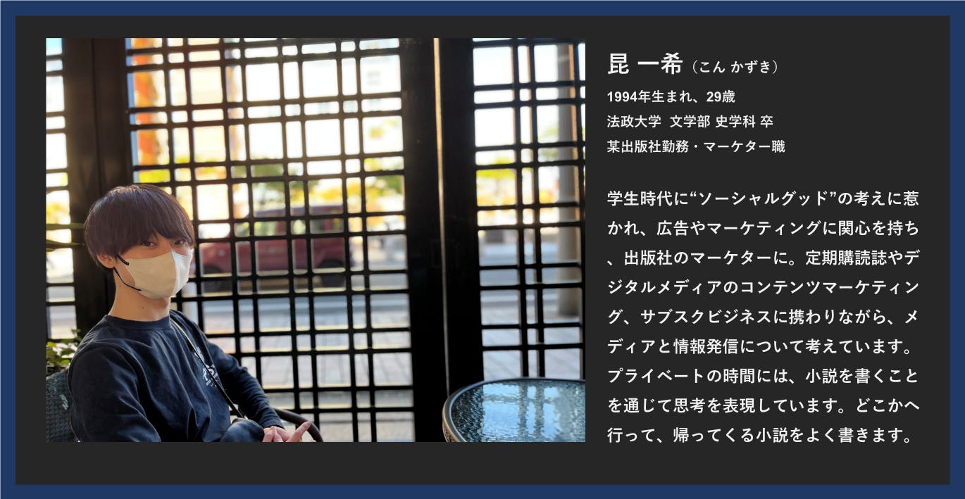 「社会科の教師になろう」。たくさん勉強して入った高校では、日本史と世界史ばかり勉強していました。一浪の末入った大学では、史学科で主に西洋近現代史を学びました。三塚と出会いました。戦争と平和の問題は常に僕の中心にありました。大学一年の夏、初めての一人旅として広島へ行き、沖縄や長崎へも行きました。他方で、歴史を残すこと、さらに転じ、情報を発信すること・表現することへ興味を抱くようにもなり、メディアやマーケティングに関心を持ちました。当時、広告界隈で「ソーシャルグッド」の概念が注目されつつあり、この考えに僕は惹かれました。また、趣味で小説を書き始めました。